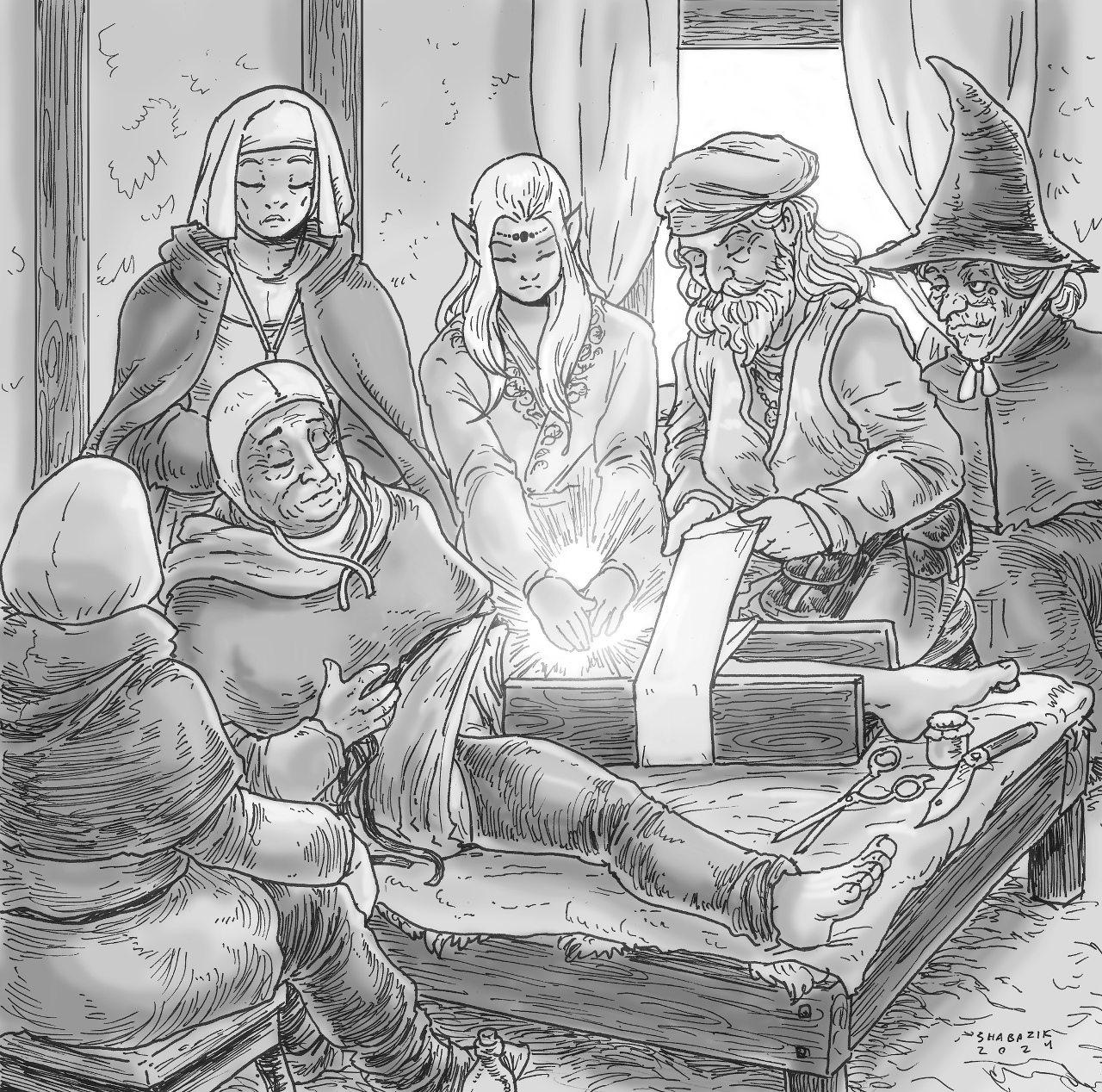 6. Цирюльник-хирург вправил кости костей, ведьма нужна для отваров и талисманов, эльф-волшебник для магического исцеления и монахиня наблюдает за остальными тремя.