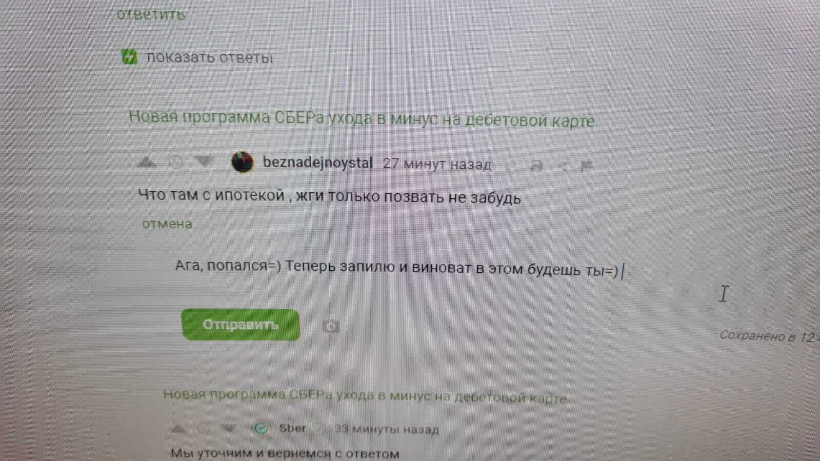 Первое шоковое состояние - как на дебетовой карте можно уйти в минус? Покурив гугол оказывается можно, только за обслуживание я не плачу, все подписки и интернет покупки на отдельной карте с балансом 0 рублей 00 копеек и пополняются только перед покупкой, валюту я не покупал. Тогда откуда минус? Ну давайте звонить в 900 и выяснять - «Где деньги, Билли?». Робот сдался быстро и я устремился к оператору, который ответил - наверное, вы что-то купили. Ага, купил, и даже ни один раз, но когда на карте заканчиваются деньги - был уверен, что схема оплаты покупок картой следующая: если на карте 100 рублей а я пытаюсь что то купить на 2000, в моем мире, с единорогами и радугой, приходит ответ - недостаточно средств. Хорошо, наверное, новая программа ухода в минус от сбербанка. Тогда скажи мне человек ученый а что, где и когда я купил? В ответ тишина, потом - подождите минуточку и опять тишина и так по кругу. Спустя 10 минут: я не могу понять что случилось переключу вас другому специалисту - уже интересно. Другой специалист начал предполагать, понимаете уровень да? Не говорить что и где я купил а говорить, может у вас подписка списалась? А может купили что то. Афигенно, а в детализации платежей это отображаться не должно? Должно. А где? А нету. Оставляйте заявку мы разберемся в течении 10 дней. Ага. И этого поста бы, наверное и не было, только вот дела удивительные творятся в нашем Сбере. Вот скриншот с номером обращениями и текстом ответа на обращение.
