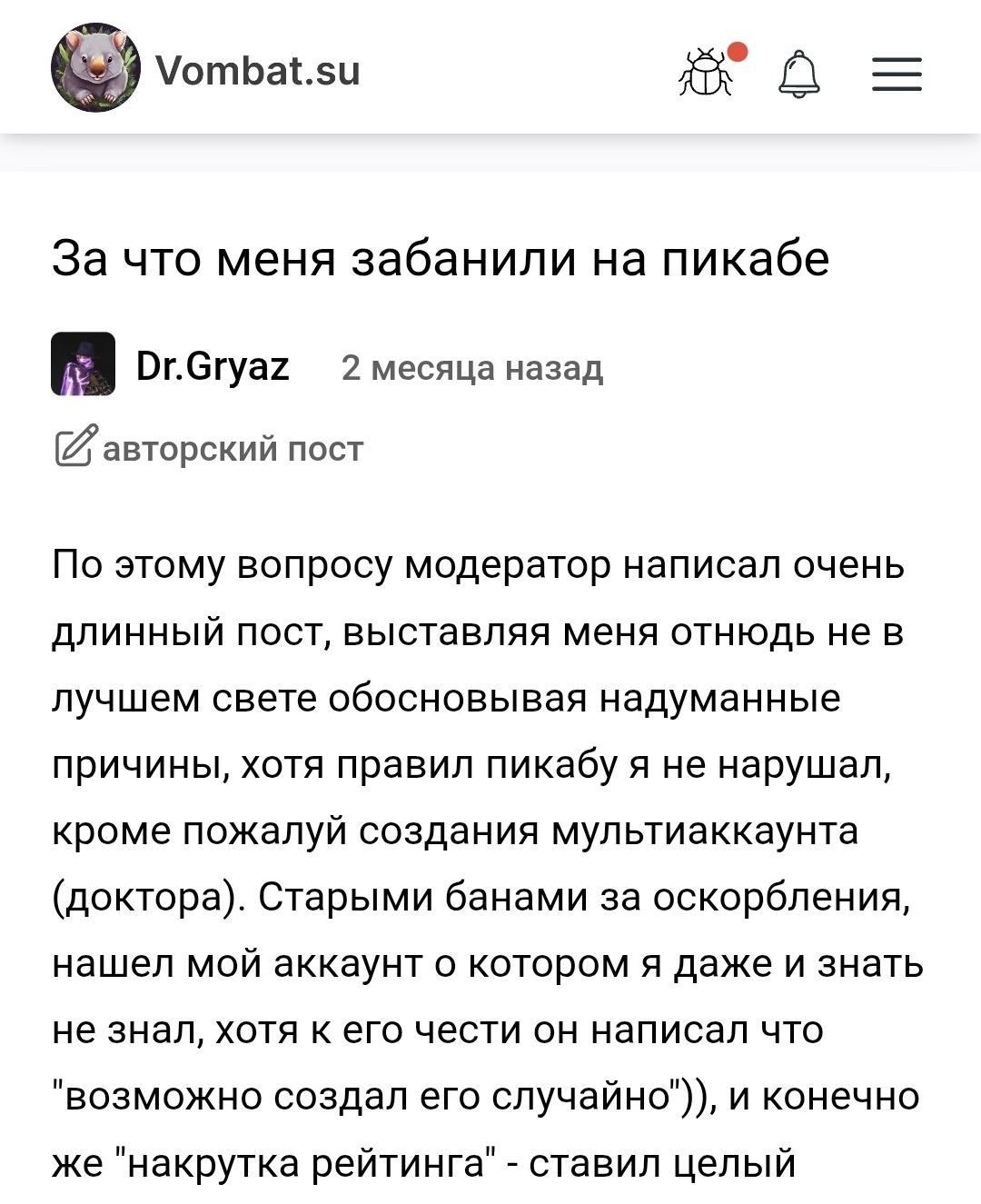 Последняя заруба касалась статьи в вики, после этого его и забанили. Он писал про это на других ресурсах, но ЧМ и там пожаловался и те посты тоже потерли.
