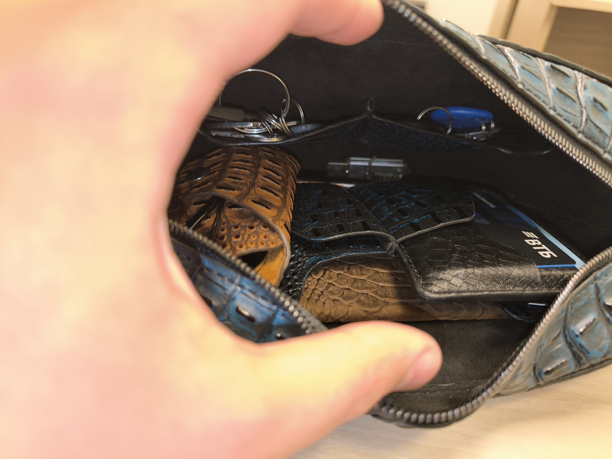 Внутри 5 карманов: Паспорт, картхолдер, рабочие карты доступа в чехлах, ключи от квартиры и ключи от машины с брелоками. Насыпом влезли очки в очечнике, флешки, и еще много места.