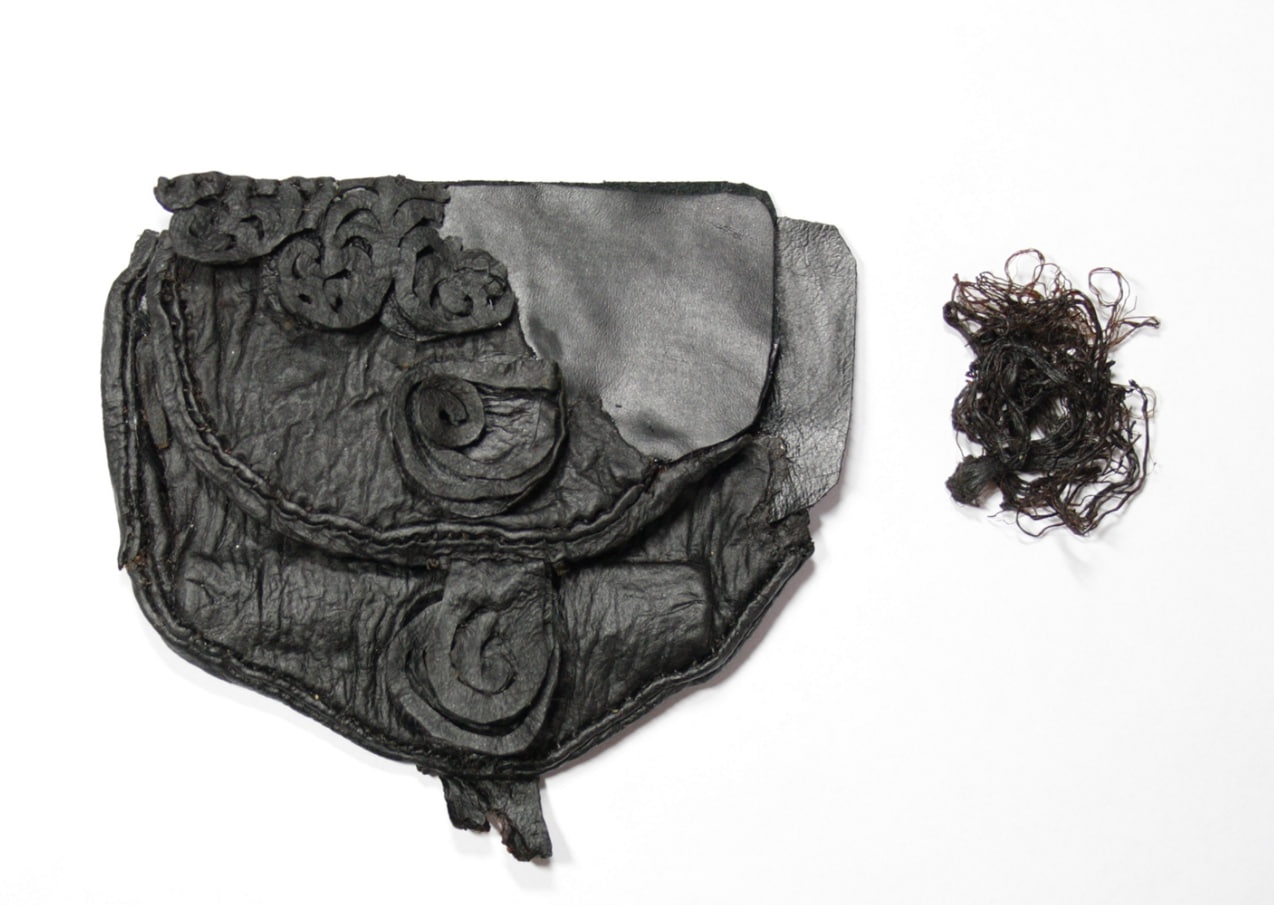 Ответ: На фотографии — скифский кожаный кошелек для костяного гребешка с аппликациями в виде растительного орнамента. Он был найден в могильнике Холаш, погребения в котором датируются I тысячелетием до н.э. (на территории современного Монгун-Тайгинского района республики Тыва).