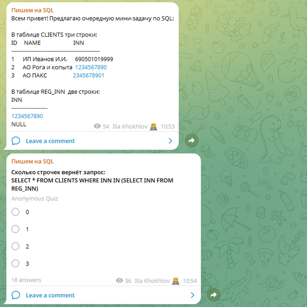 IliaHohlov Лига программистов IT Новая задача по SQL 7 месяцев назад Всем привет! Очередная задача с моего Телеграм канала про SQL и базы данных! [моё] Программирование IT Тестирование Собеседование Postgresql SQL 2 Ещё 0