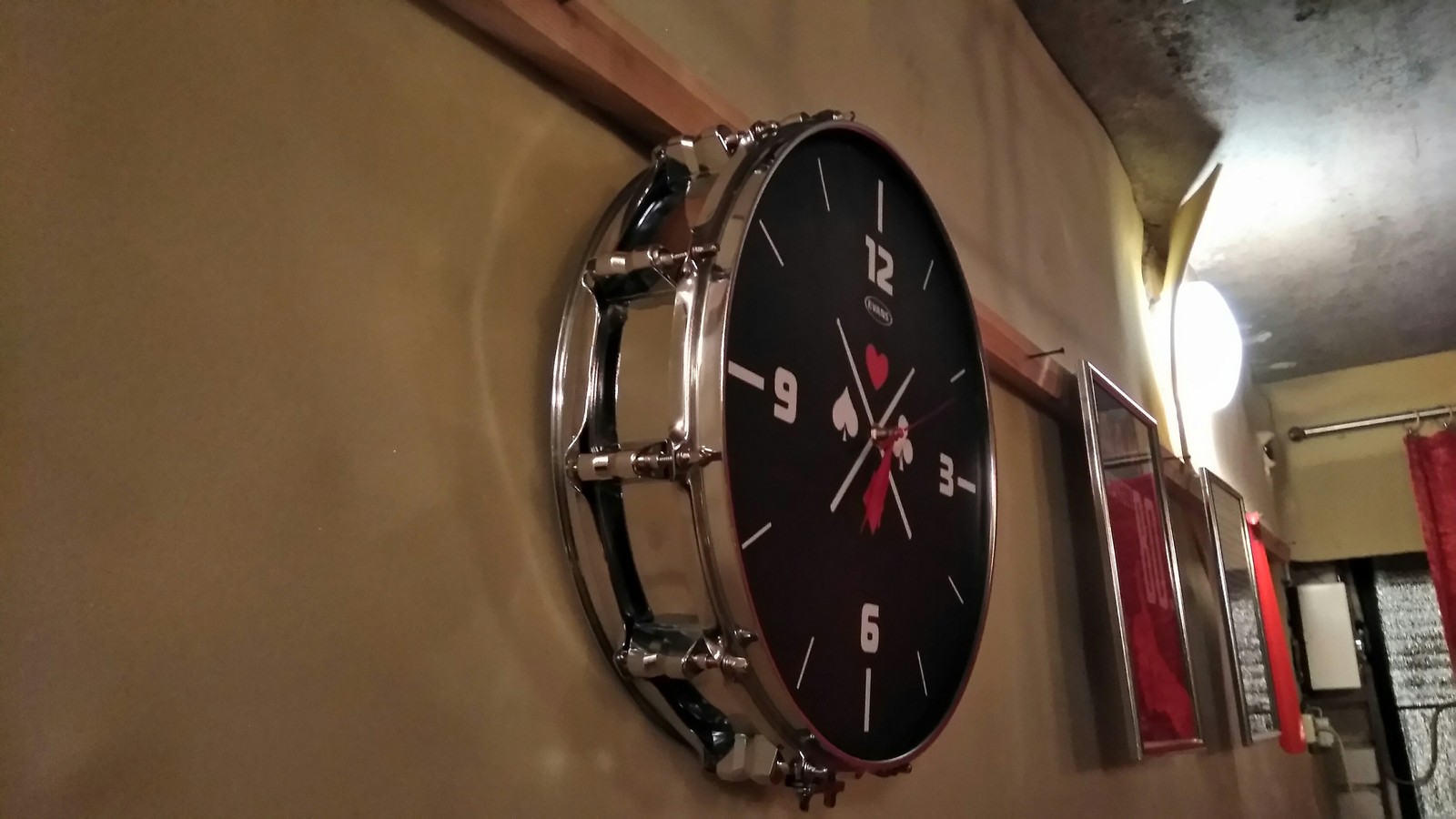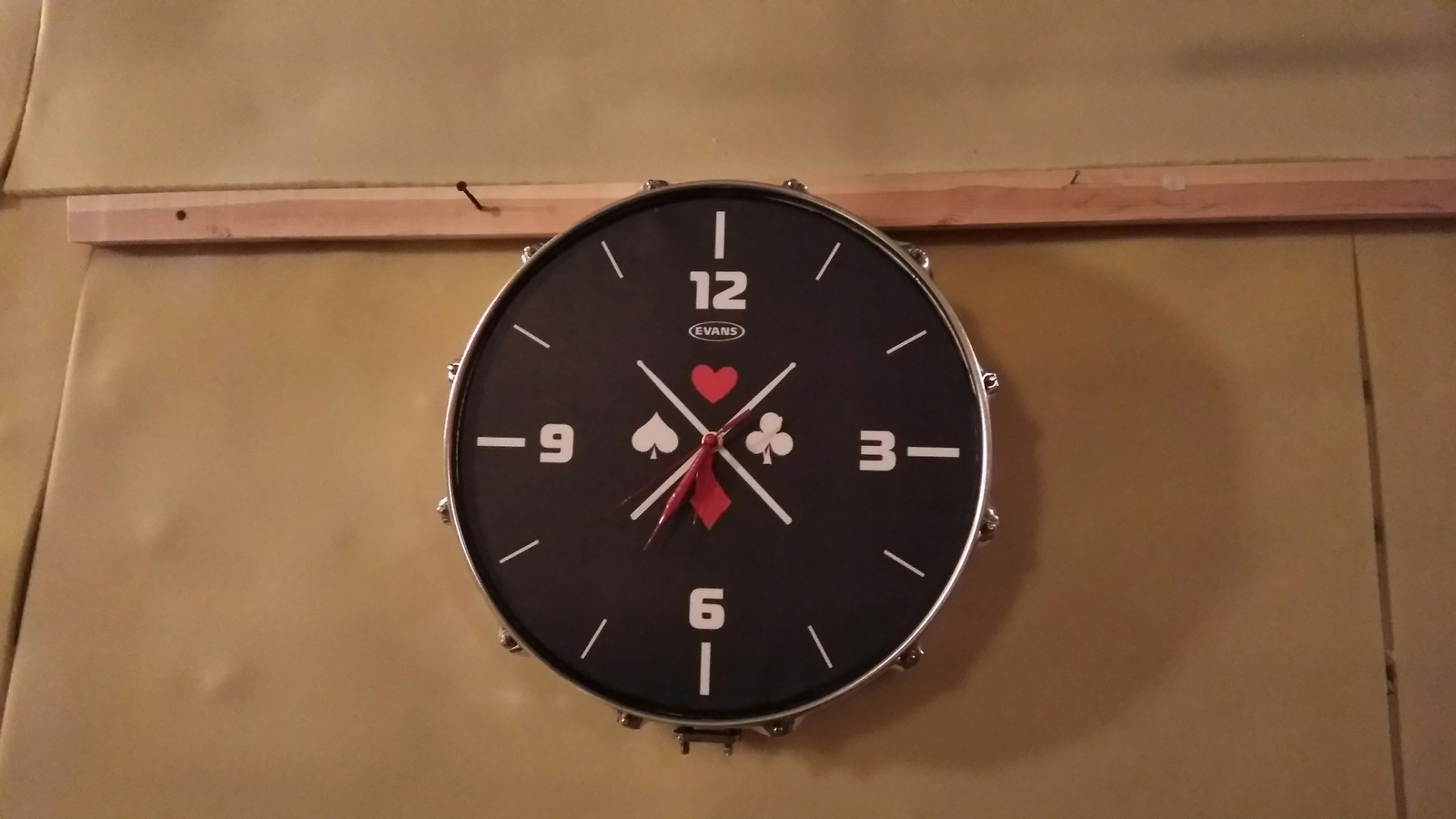 В общем, когда то года 3 назад, увлекся я таким замечательным музыкальным инструментом, как ударная установка. Купил установку с рук, в бонус шел не самый лучший малый барабан пиколо фирмы Peace. Ну и учился на нем около года. Время шло, владение инструментом увеличивалось, малые барабаны сменялись один за другим, а металлический друг так и пылился до сегодняшнего дня. Долго думал, что с ним сделать, выкинуть жалко, продать тоже, деньги не большие. В итоге заказал под размер принт на оракале, купил часовой механизм и вот оно.