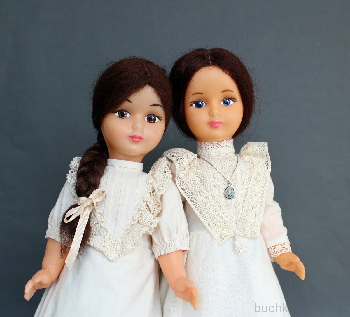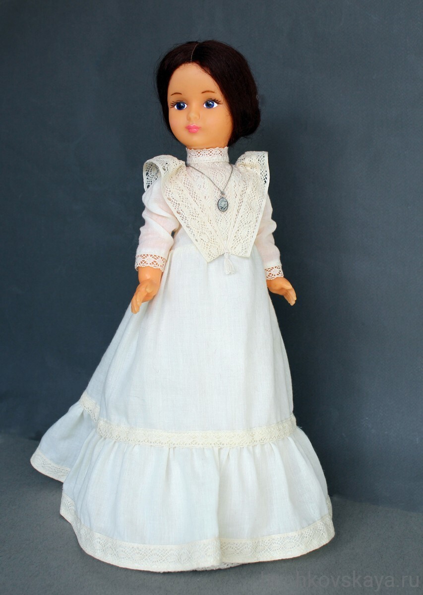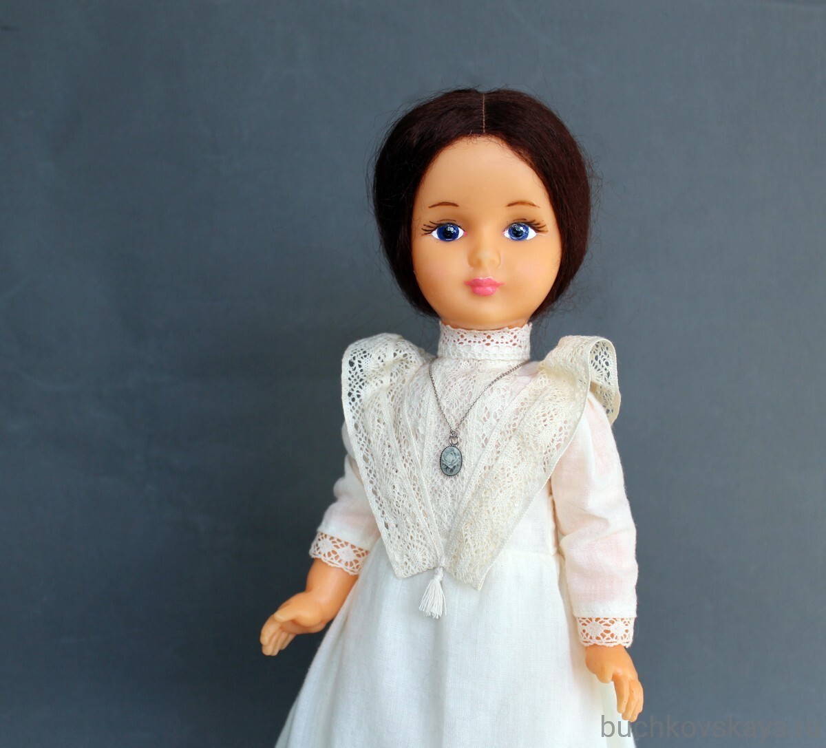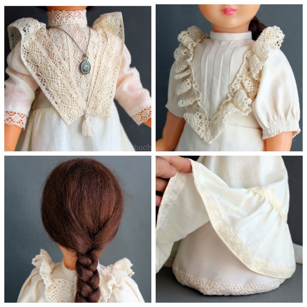 Сохранились родные паричок и роспись лица (чуть-чуть подправила). Сшила новую юбку-каркас. Платье из плотной винтажной ткани, украшено х/б кружевом.