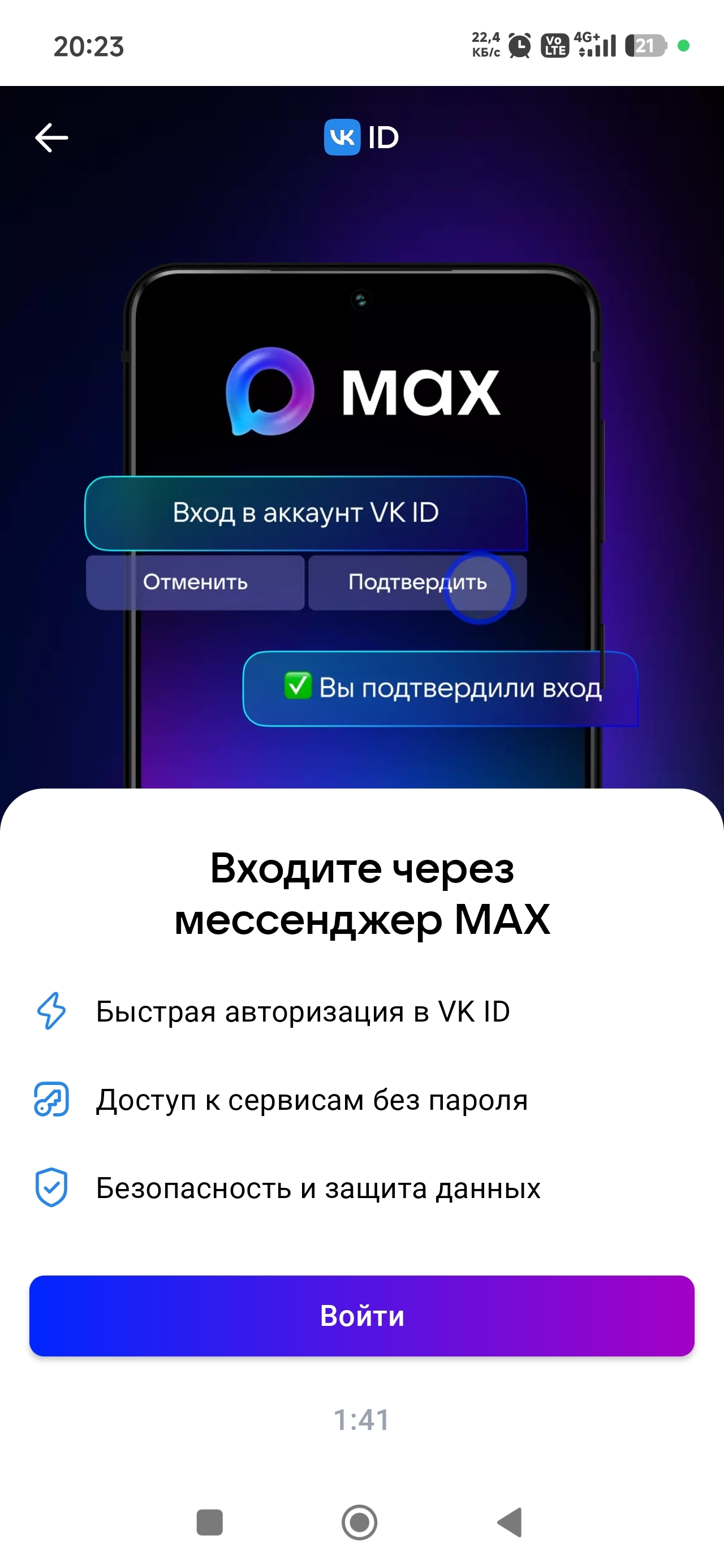 Захожу вчера в приложение ВК., а там выполнить вход. Думаю странно, почему был выход с учётки. Но после войти, всё стало понятно. Они специально сделали выход, чтобы ты авторизовался с помощью MAX.