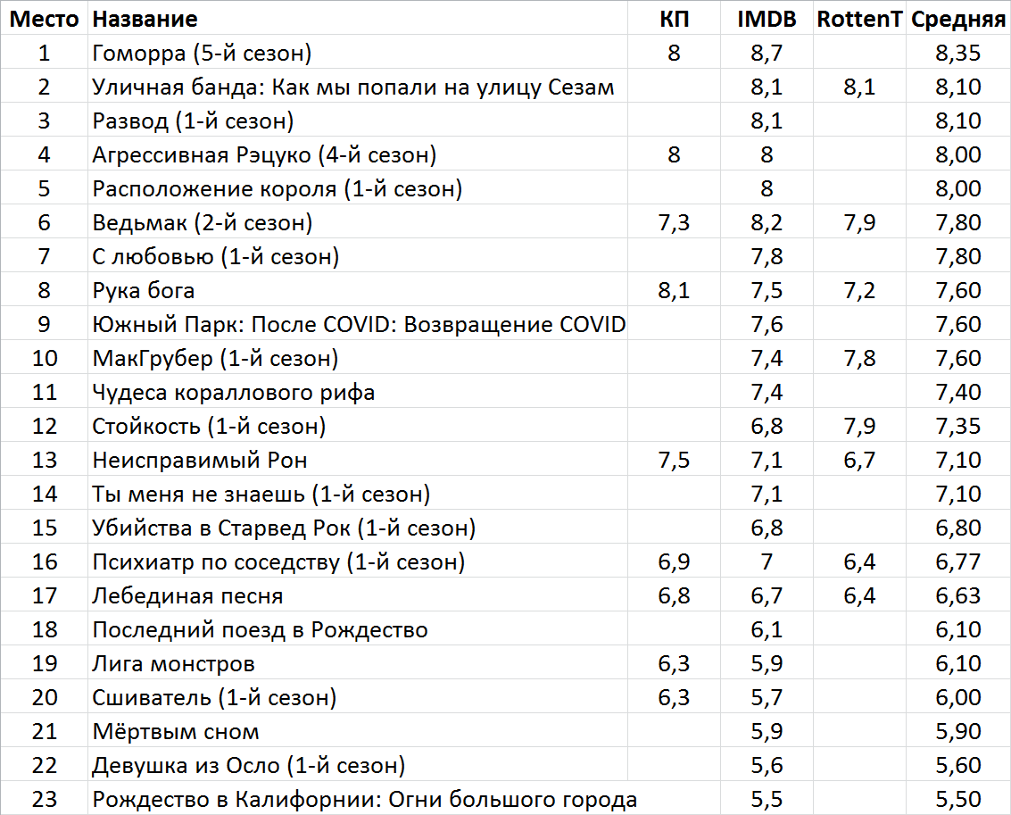 Таблица с рейтингами Кинопоиска, IMDB и Rottentomatoes.