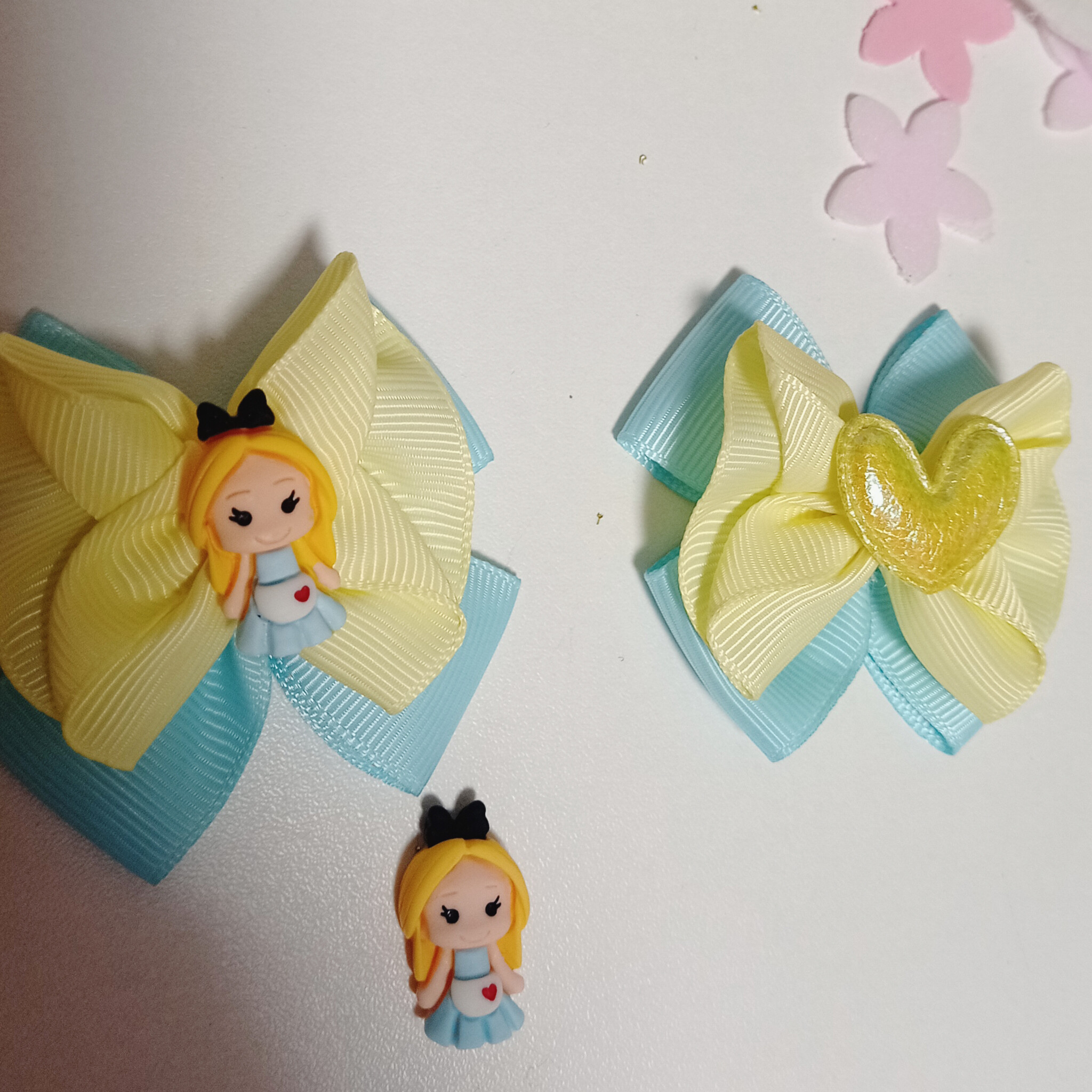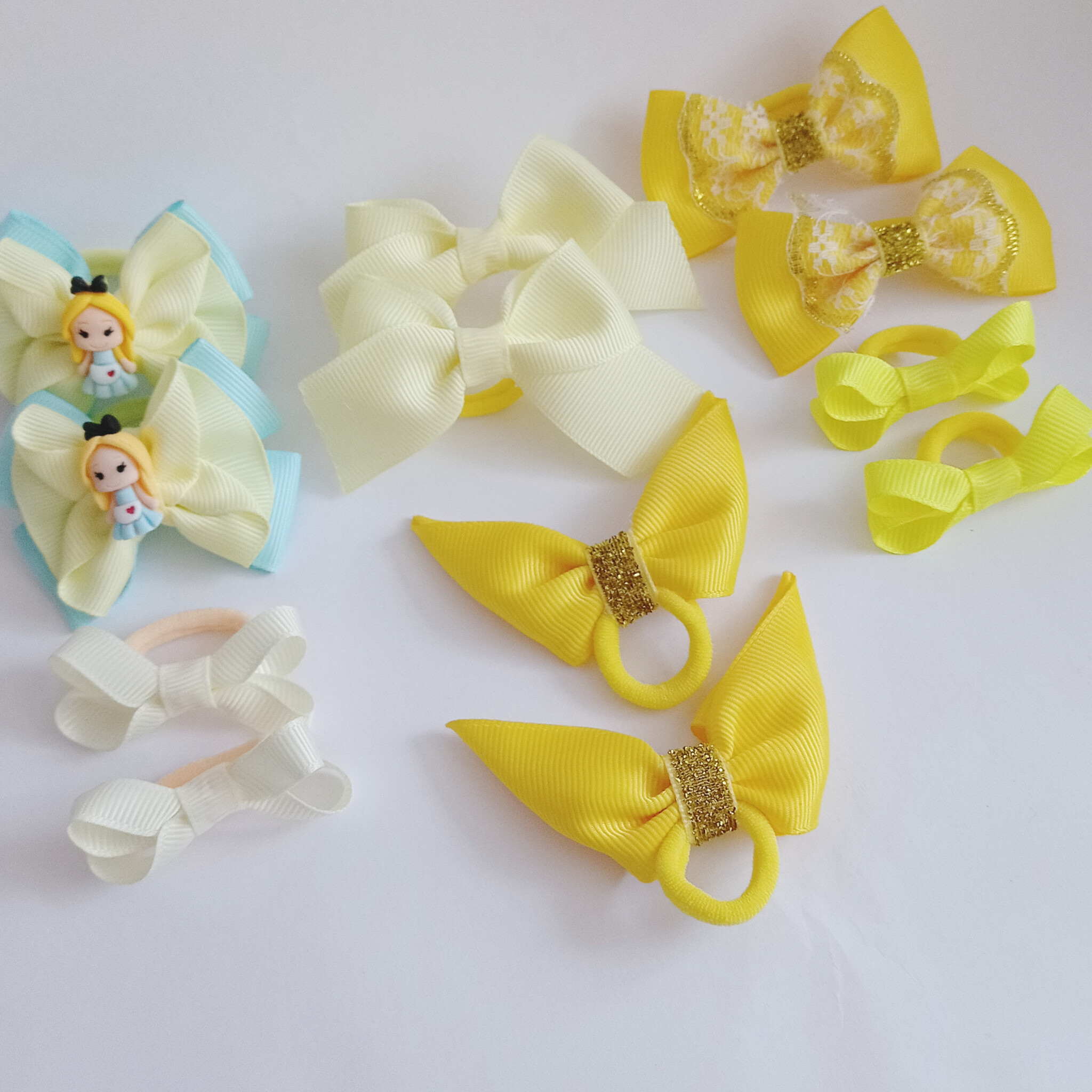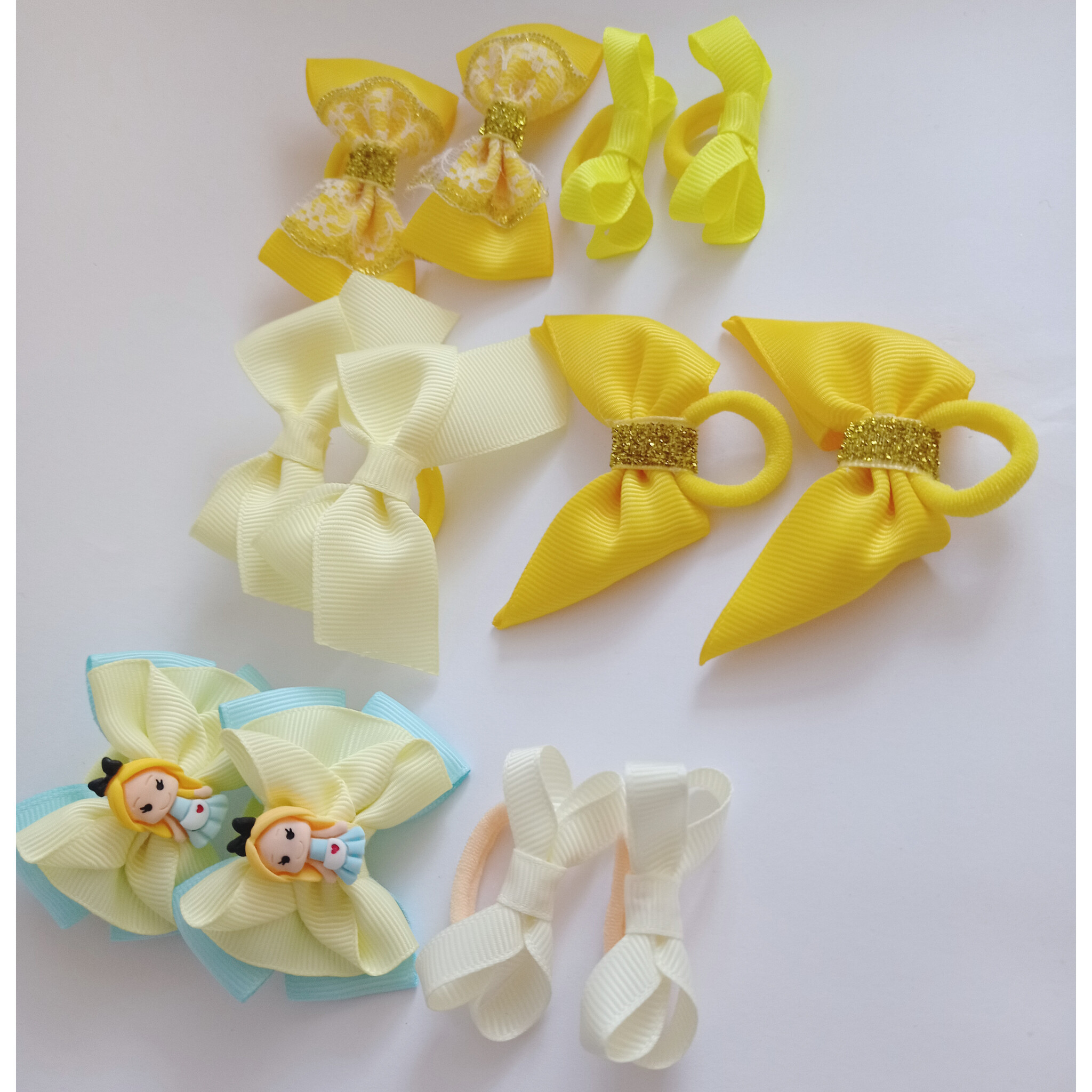 Привет всем. Вот недавно пришла девушка за парой бантиков дочке на утренник.ей так понравились бантики,что она взяла 6 пар разных бантиков. И заказала мне сделать жёлтых ,ее дочка обожает жёлтый,вот я сделала такой комплект на выбор,не знаю,какие понравятся. Бантики должны были быть маленькие ,лёгкие для садика на повседневку. Как вам?)