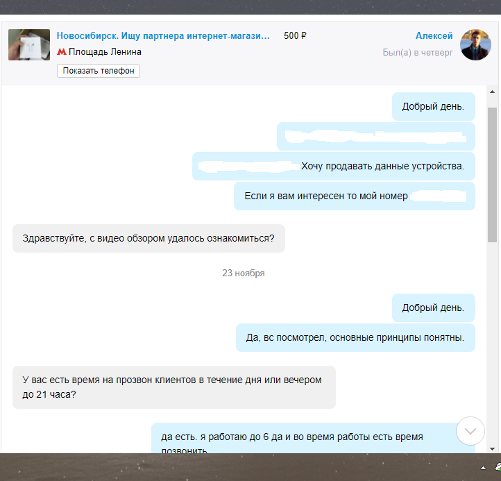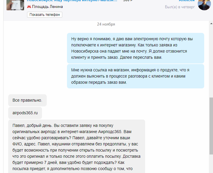 Некто Алексей искал партнеров на территории нашего региона по продаже беспроводных наушников, сейчас этого объявления уже нет, но сохранилась переписка: