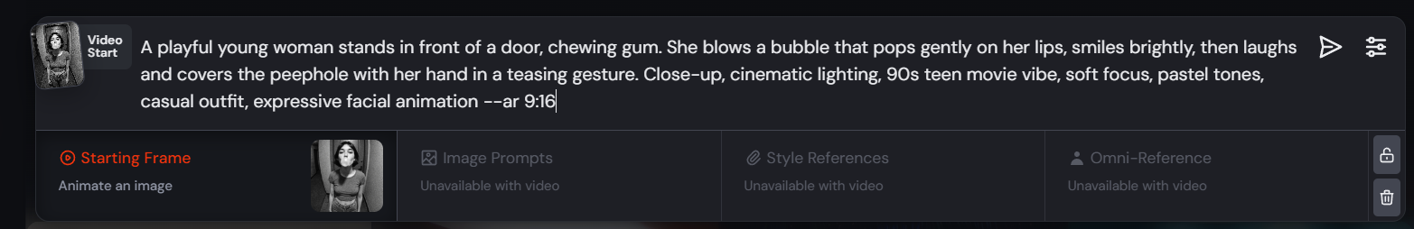 Я выбрал картинку, где девушка стоит у двери с дерзким видом и надутым пузырём, и перетащил её в поле Starting Frame — это как бы начальный кадр, из которого Midjourney будет делать видео.