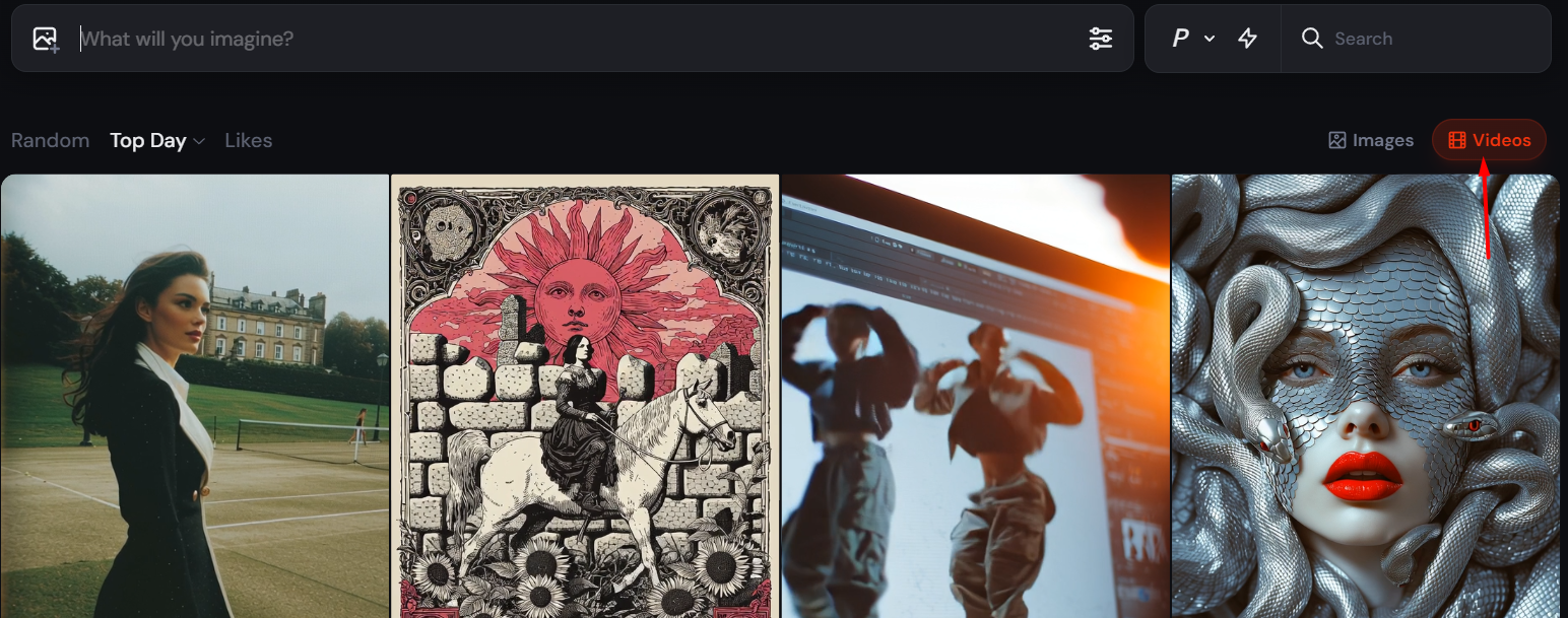 Кнопка “Videos” в правом верхнем углу галереи переключает отображение с обычных статичных изображений на анимированные работы, созданные через V1 Video Model.