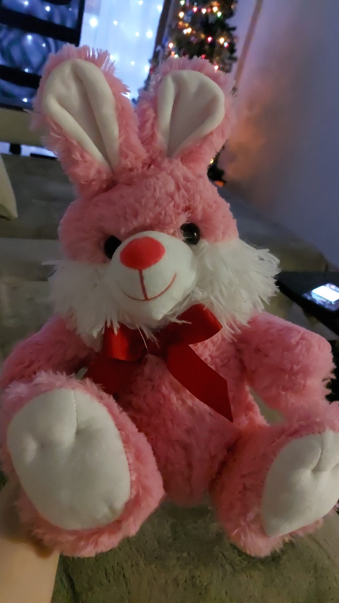 Вечером уже, когда вернулись мы домой, переделав все домашние дела, включив гирлянду на ёлке, я увидела, что под елкой сидит этот самый зайка, как муж успел его купить мне всё еще не понятно, рядом же всё время были, говорит что заяц сам прискакал и он тут не причем, загадочная улыбка его правда выдает. Но теперь я снова счастливый обладатель, своей любимой детской игрушки, пусть и немного повзрозлевшей. Вот такая новогодняя история.