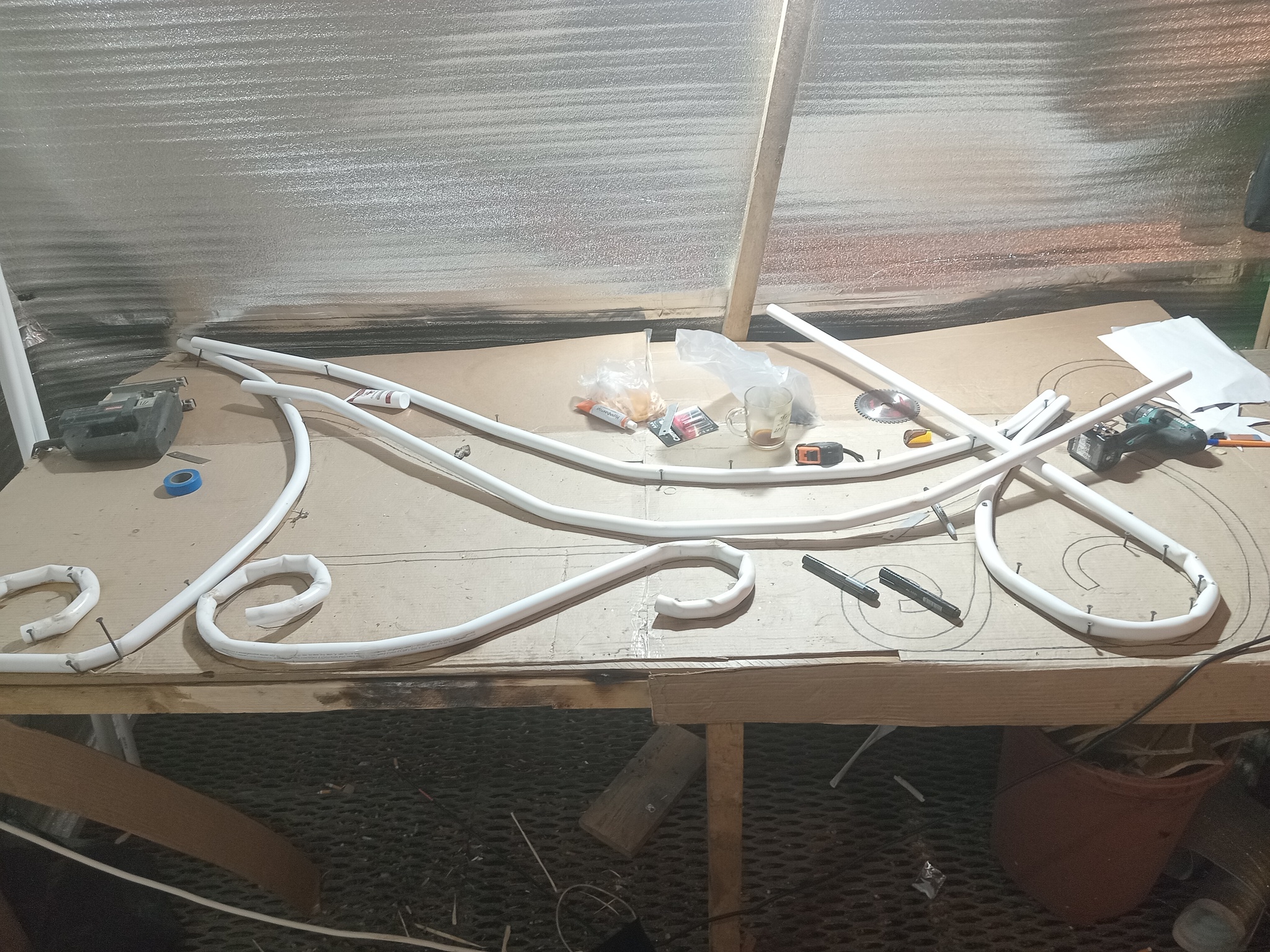 Гнем трубы. Выбрали полипропилен. Лёгкий. Так как сам Дед Мороз весит 100 кг. А ведь ещё заказы.
