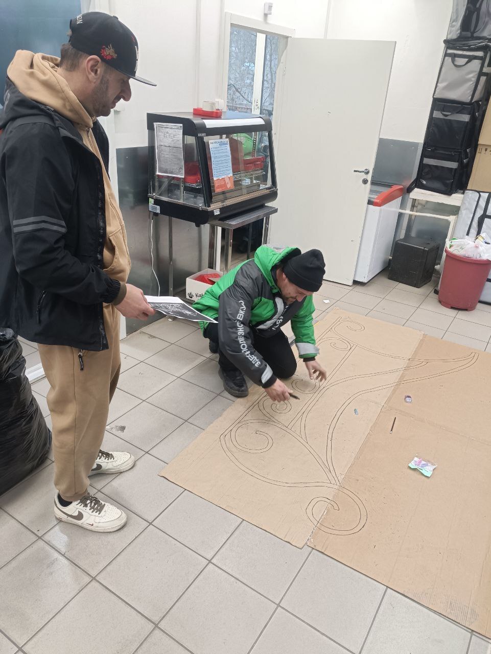 С куратором пытаемся нарисовать будущие сани. Эх. И пому я не художник