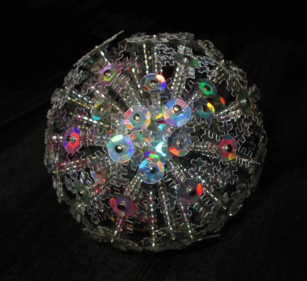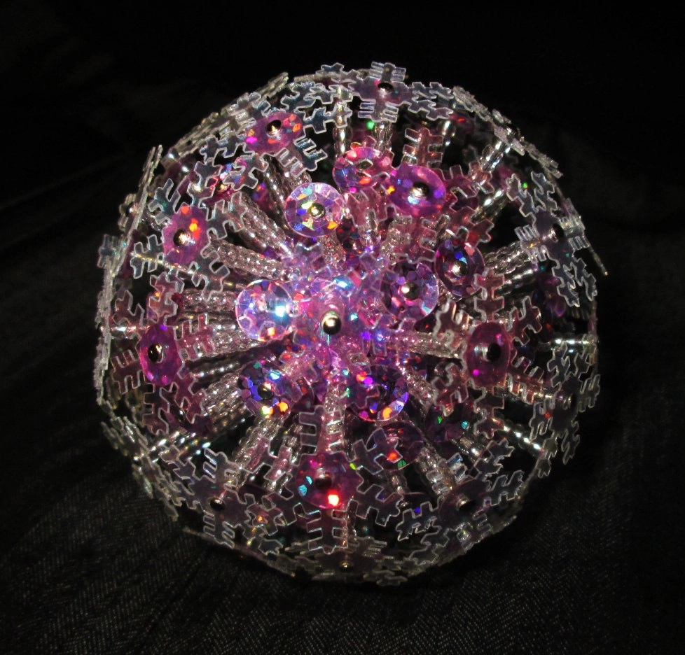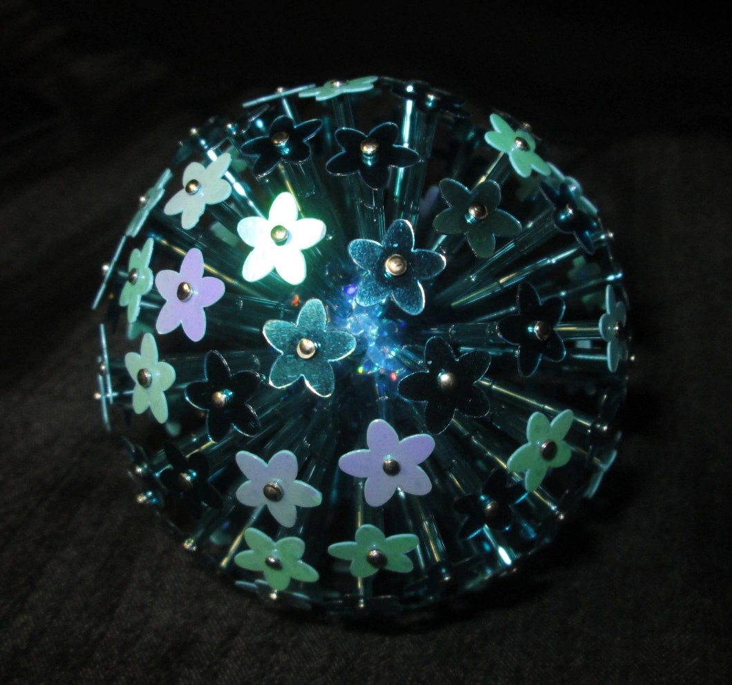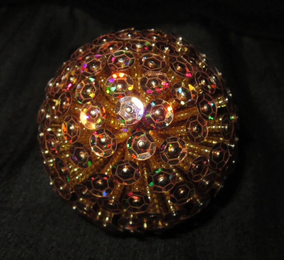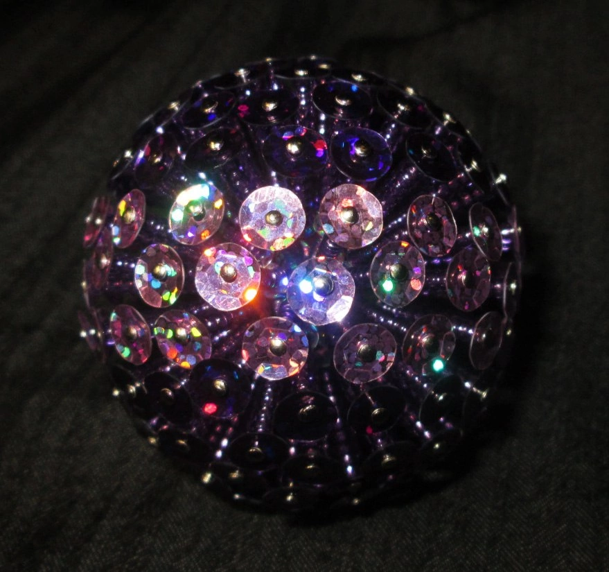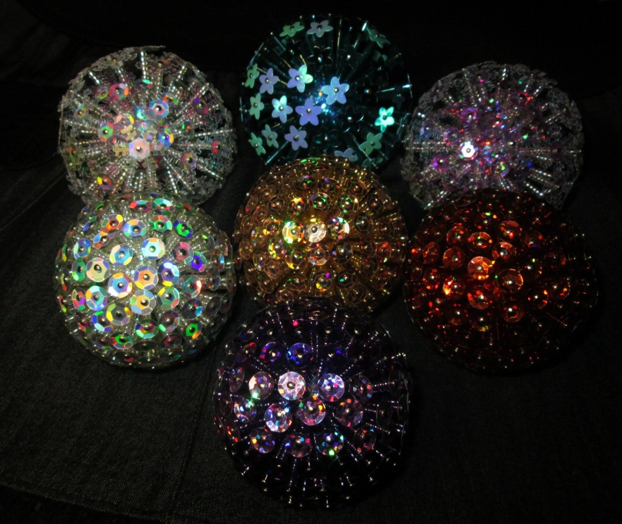 Нужен мячик-попрыгунчик, пайетки двух размеров, бисер и много булавок-гвоздиков. Набираем пайетку покрупнее, потом бисер (оставляем миллиметров пять до кончика булавки), пайетку маленькую. Втыкаем в мячик. Повторяем. Получается красивое)