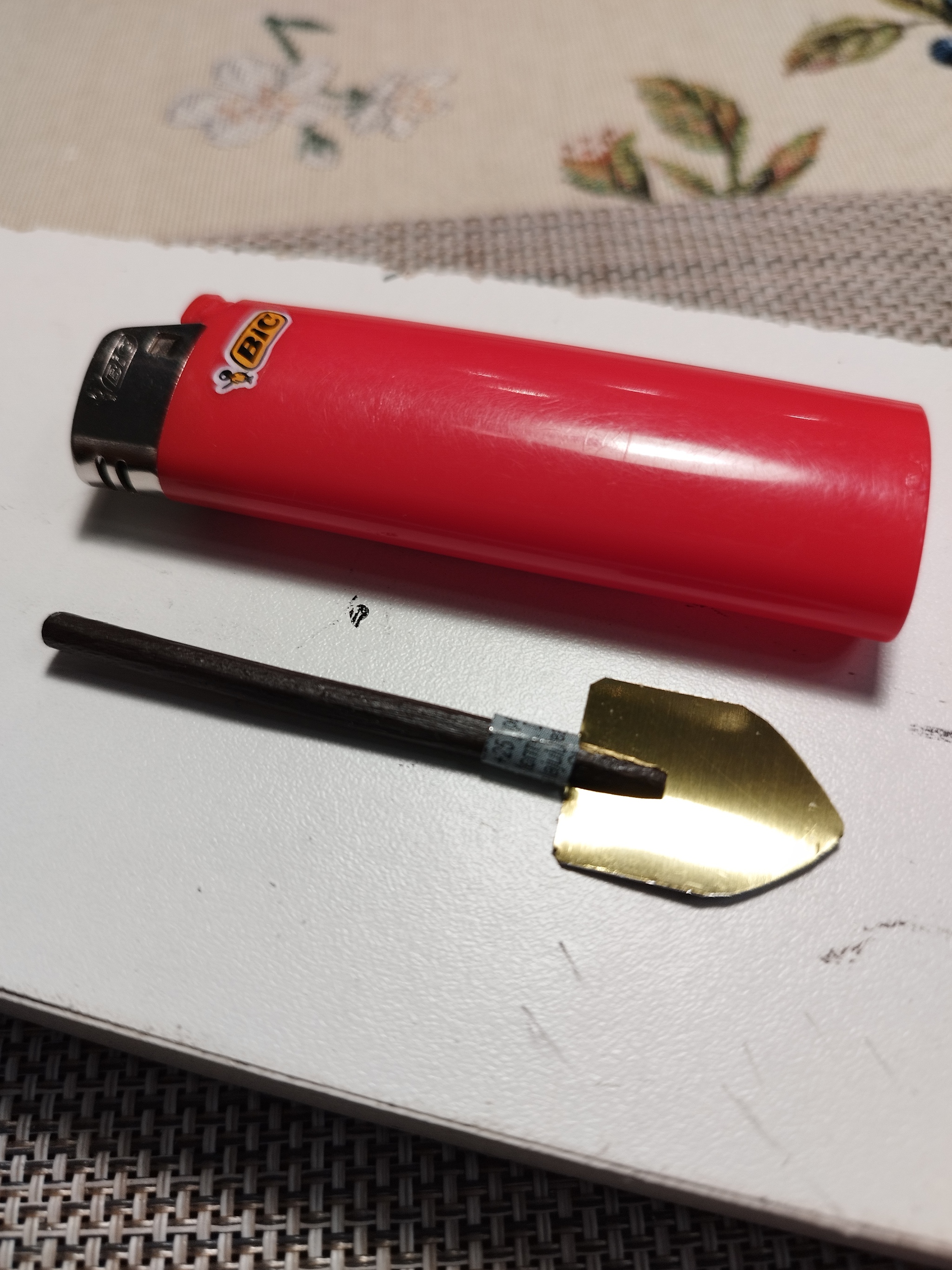 Отдельно лопата из той же консервной банки и палочки от суши для большого домика