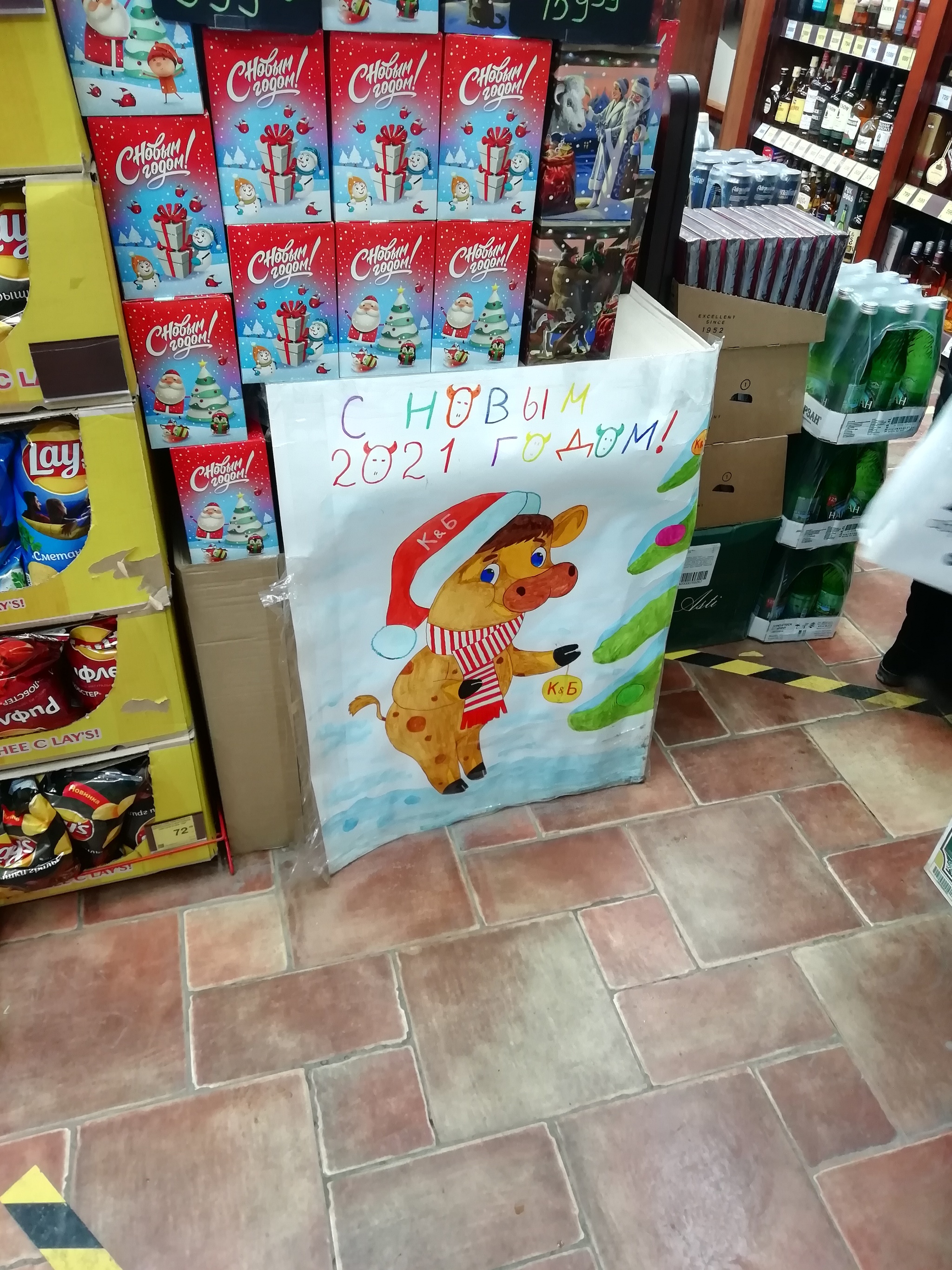 Как выяснилось, сотрудники магазина сами придумывают, рисуют и украшают магазин в свои выходные или в рабочие дни, пусть и не для своего рутинного новогоднего настроения и труда, так для людей, порой заходящих туда с не самыми веселыми мыслями на душе. И висит все это новогоднее в дальнем углу магазину, на уровне пола, поцарапанная обувью по углам, что меня возмутило и вызвало некое недовольство, почему это не висит высоко в обозреваемом доступе, что бы каждый видел, и сотрудники и покупатели, пусть и не каждый оценит, но все же такое должны видеть все, кто-то улыбнется, кто-то почувствует дух праздника.