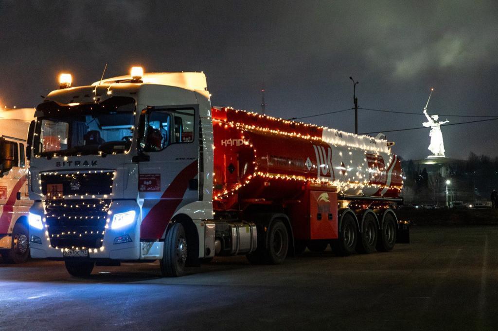 Бензовозы, украшенные яркими гирляндами, курсировали по городу. Техника попала в поле зрения волгоградцев накануне вечером у Памятника Героям Сталинградской битвы и не только.