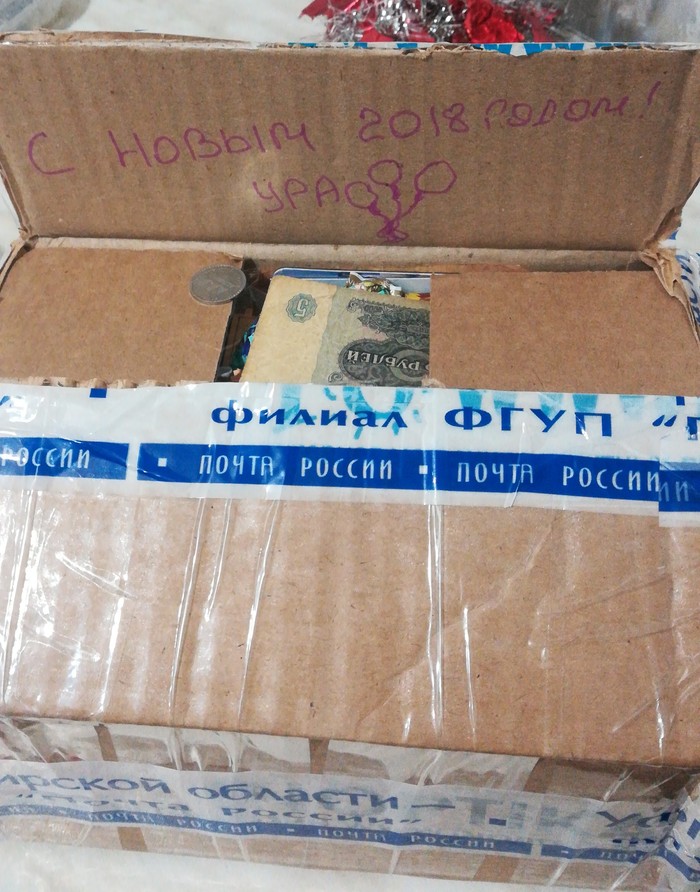Трогательные поздравления за которыми стали видны пять советских рублей и монетка( тайный Санта не забыл про пожелания). На пять советских рублей раньше можно было купить 20 буханок белого хлеба, что по нынешним деньгам рублей 600 (инфляция однако 😛).