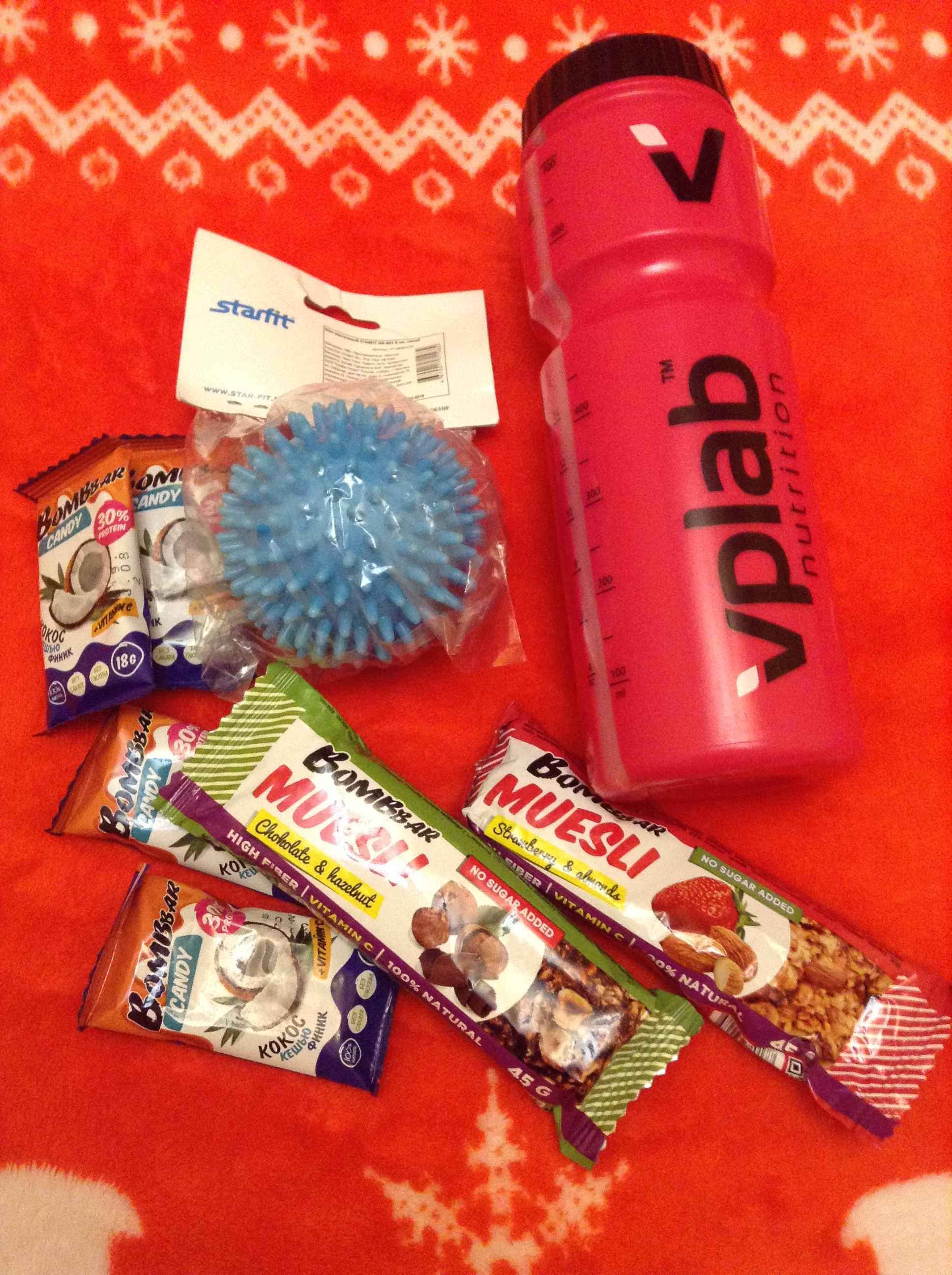 - Целый набор для тех, кто живет под лозунгами: "О, спорт! Ты - мир!" и "Даешь -10кг к Новому году!". Второй - это прям про меня) Поэтому Бутылочка для воды, массажный мячик и полезные лакомства будут использоваться мной регулярно, это - факт!