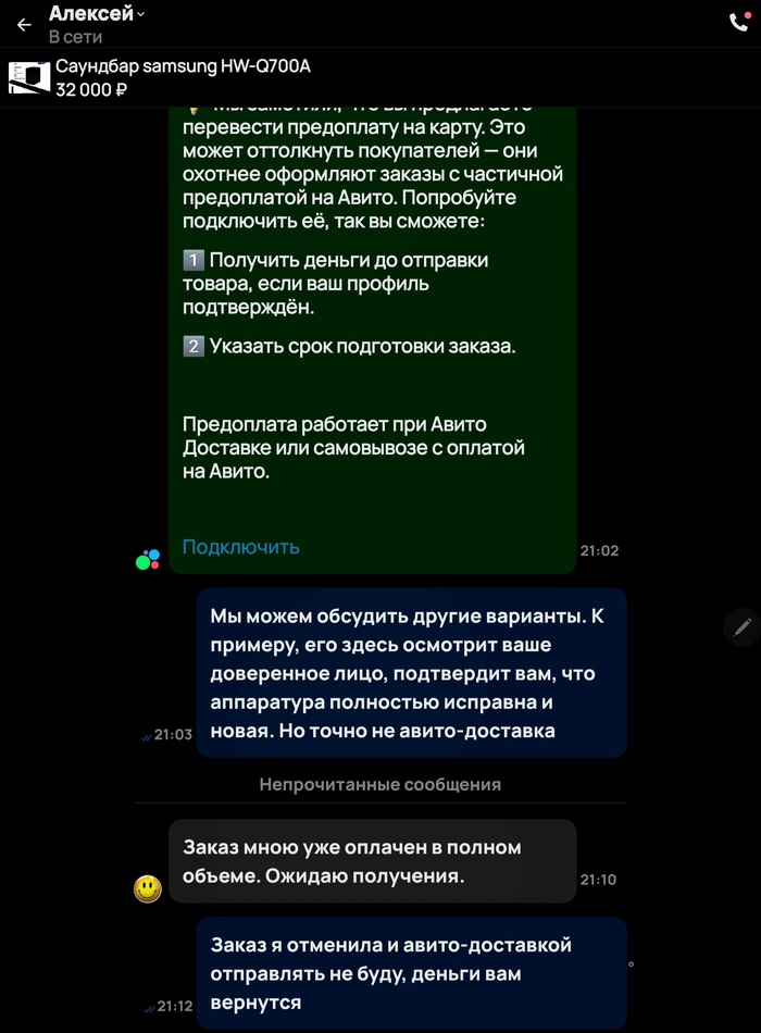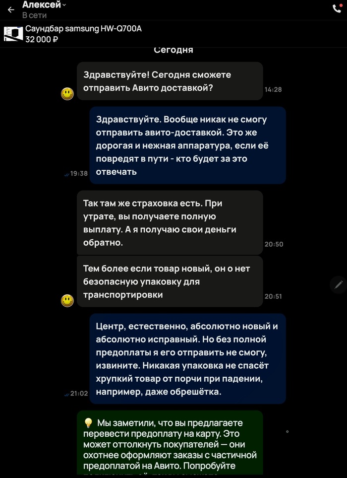 Заметьте, "альтернативный вариант", предложенный человеку в переписке, не предполагал продажу в обход площадки, не предполагал "предоплату на карту", как показалось боту, а именно осмотр техники на месте.