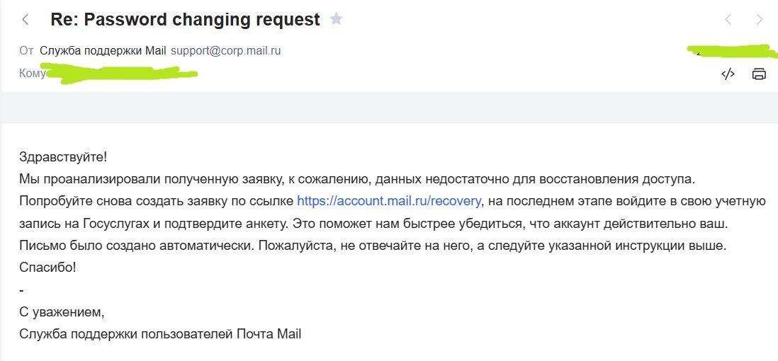 Может кто сталкивался с такой проблемой. Такое ощущение что шаблонами отвечают. Они же могут посмотреть все заходы на почтовый ящик что они с одного IP-адреса сделаны и провайдер с одного города. Я всё понимаю, если я в зарубежной стране пытался восстановить ящик, в Германии например или Канаде, а тут вроде отечественный сервис, и такая проблема, просто зайти в свою почту.