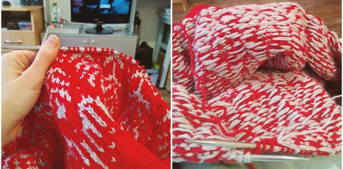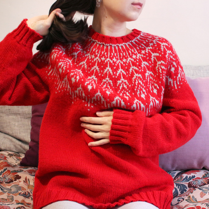 Мой первый жаккардовый новогодний пуловер. Красный, с узорочьем по круговой кокетке. Схему восстановила по фото одной из работ вязальщицы из Ravelry. Т.к. я из ЛЛ, то образец я не вязала, и свитер у меня вышел "на вырост".