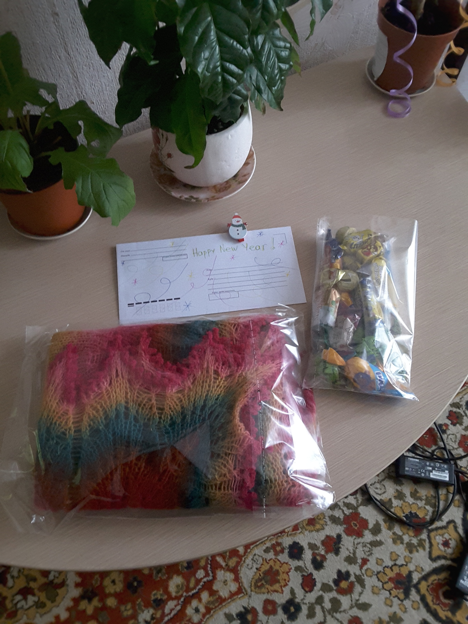 Как приятно получить новогодний подарок от постороннего человека. Конфетки, письмо, милый снеговичок-прищепка и самое приятное это шаль) очень красивая, теплая, ручной работы )Такой ни у кого нет))