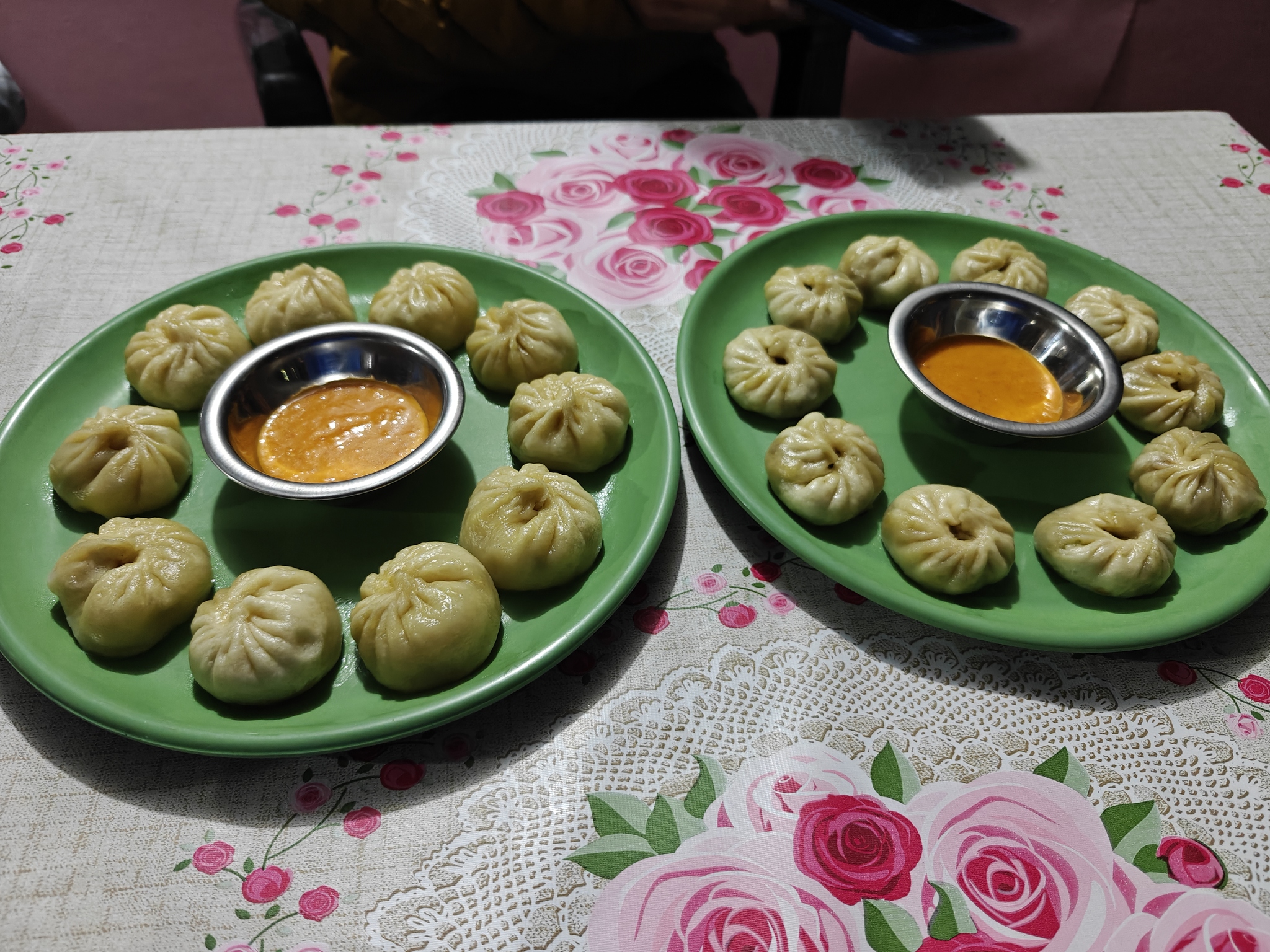 Ужин принято заказывать заранее. Мы заказали момо с курицей и mixed momo по 700 NRP за порцию к 19-00, а пока решили пройтись дальше прогуляться. Успели посмотреть на стремительно скрывающуюся в тумане гору Мачапучаре. К нам привязалась большая пушистая собака и сопровождала.