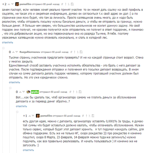 Сейчас за окном двенадцатое марта. Ближайшие праздники - в мае. Думаю, что сейчас самое время обсудить тему обмена подарками. Дорогие наши пикабушники @Kpoxaru, @RazgulGormonov, @kimh, @gepka, а так же @Sonnenstrahlung, - приглашаю вас для совместного обсуждения проблем, дабы ленивыми летними днями и осенней кружевной порой вы создали мощного гиганта программной мысли, который контролировал бы обмен подарками.