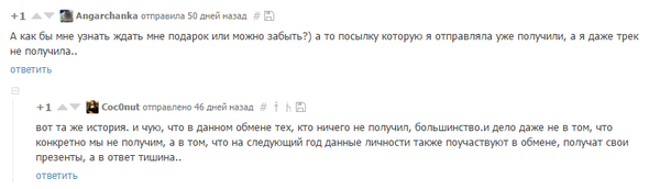 Просим не создавать посты с оповещением об отправке посылок/задержках, иначе они будут удаляться, подобную информацию стоит передавать через личную переписку или организаторов, так больше шансов что информация дойдет до получателя.