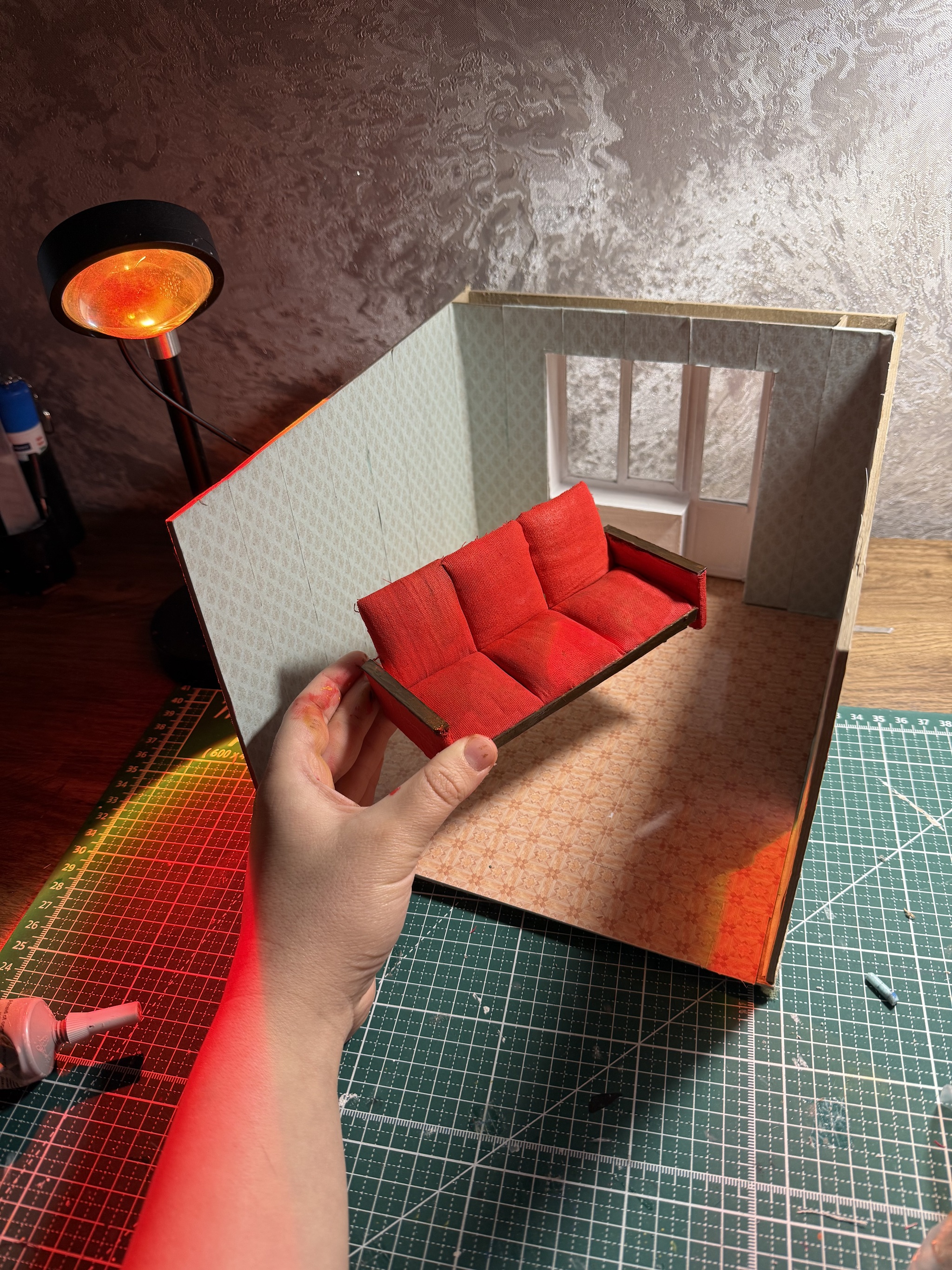 Сделала советский диван из подручных средств -картон , поролон, ткань бязь (покрасила в красный ) .В последующем красный цвет высох и стал бледнее + я добавила розовые разводы (словно краска выцвела )