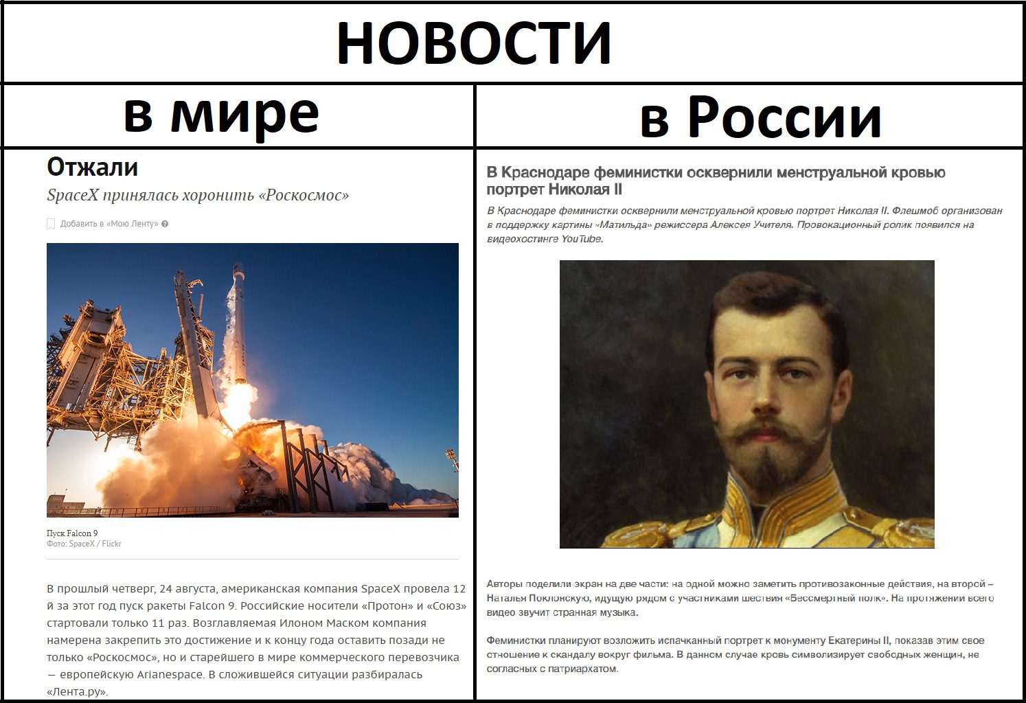 Krabbator Баяны Новости 8 лет назад Такой вот загнивающий запад и процветающая русь. ссылочки: https://lenta.ru/articles/2017/08/28/roscosmos/http://actualnews.org/exclusive/195813-v-krasnodare-feminist... Новости США Россия SpaceX Илон Маск Матильда