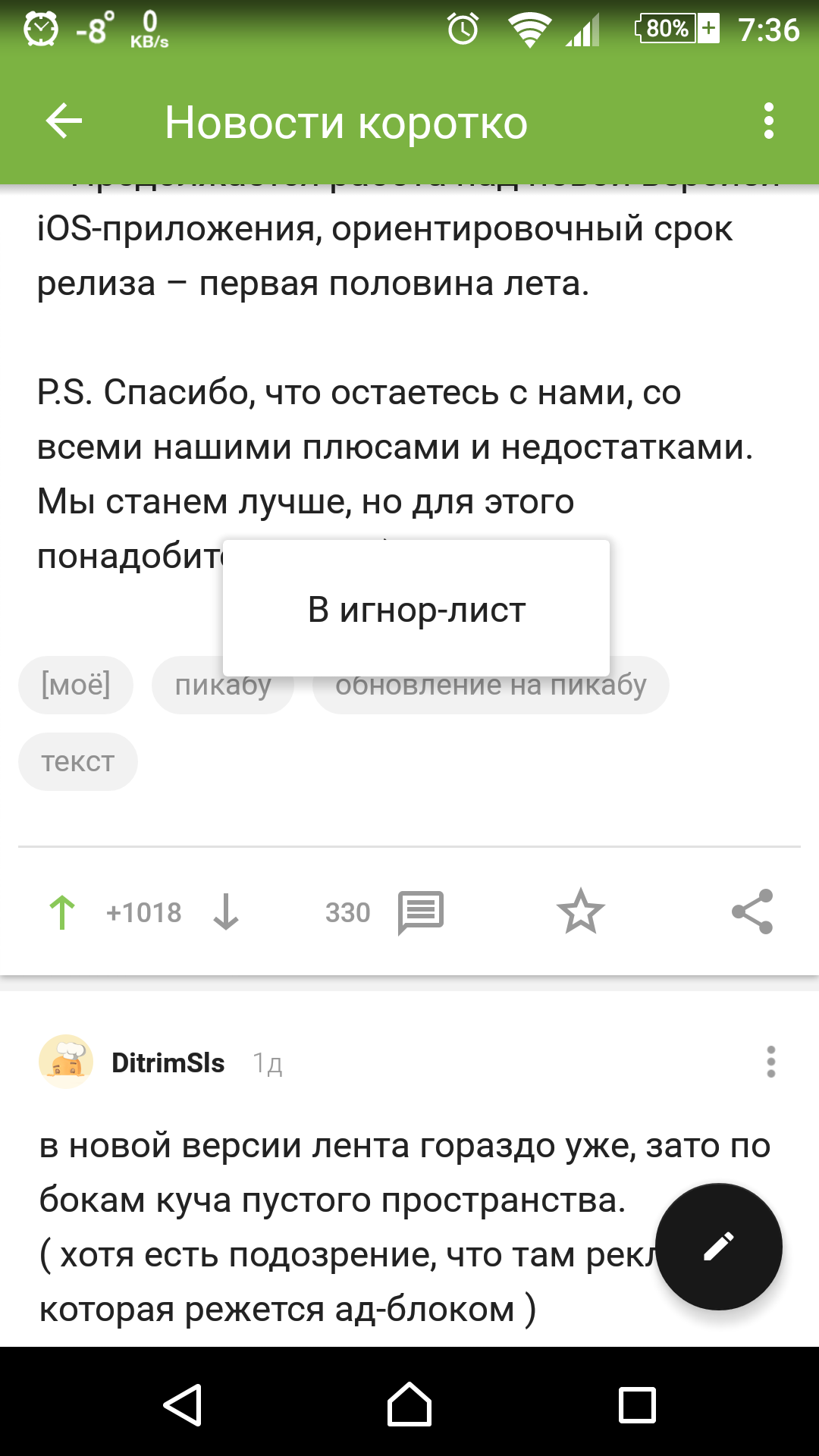 – Параллельно работаем над решением проблемы некорректных тегов, указываемых к постам. Надеемся, это поможет более точно фильтровать посты с помощью игнор-листа.