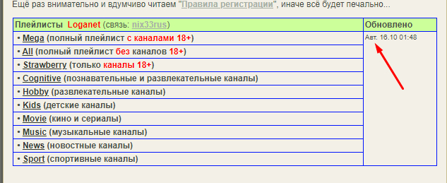И, это может быть удивительно, есть ещё другие ссылки. Что мне ещё оставалось делать, сайта нет, плейлистов с отдельными категориями тоже нет. И вот один из пользователей подсказал мне разместить плейлисты на сайте iptvin.ru, за что я его благодарю. Я сначала понял, что стандартных условий выкладывания плейлистов мне не хватает, а потом написал Denisoft и объяснил случившуюся ситуацию. В итоге, плейлисты теперь также доступны здесь