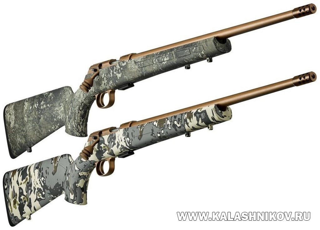 Стрелкам предлагается лесной камуфляж TrueTimber Strata либо альпийский вариант Veil Big Sky. Ствольная коробка, ствол с компенсатором и рукоятка затвора имеют PVD-покрытие с коричневатым оттенком.