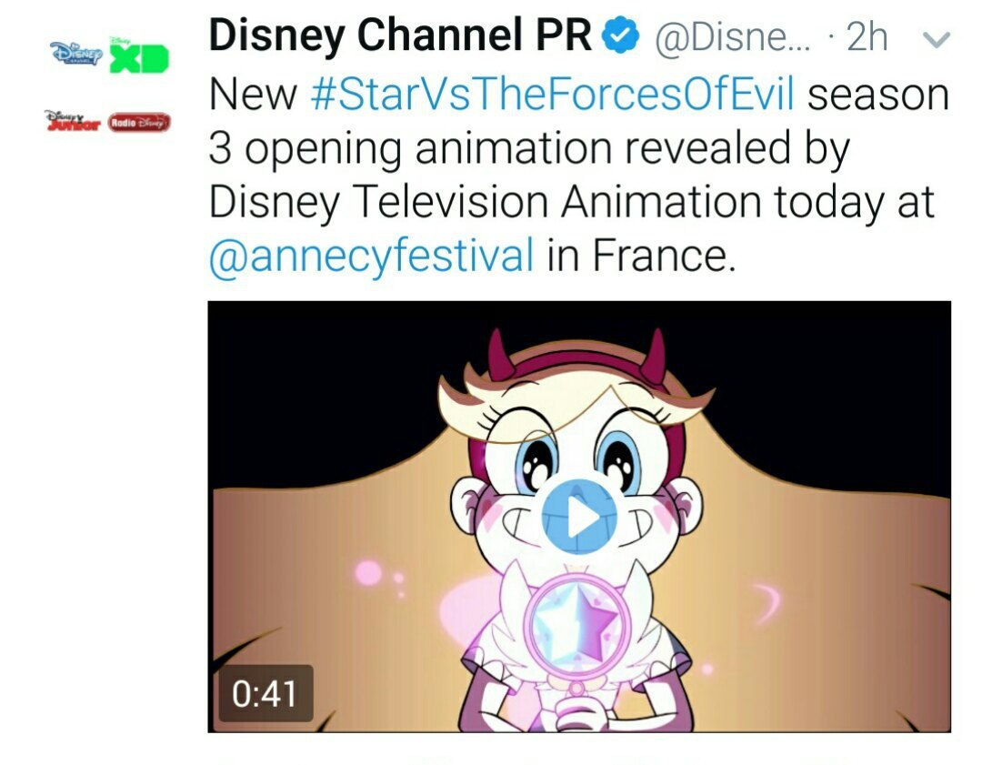 Сегодня официальный пресс аккаунт Диснея выложил в публичный доступ полное интро 3 сезона Стар против сил Зла, приятного просмотра.