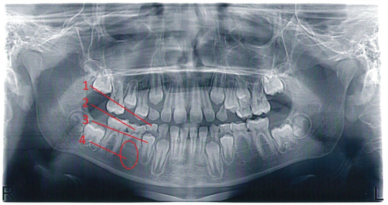 3. Постоянный первый премоляр, он же 4 зуб, который растет на смену молочному 4 зубу и уже почти его выпихнул. Корни молочного полностью рассосались