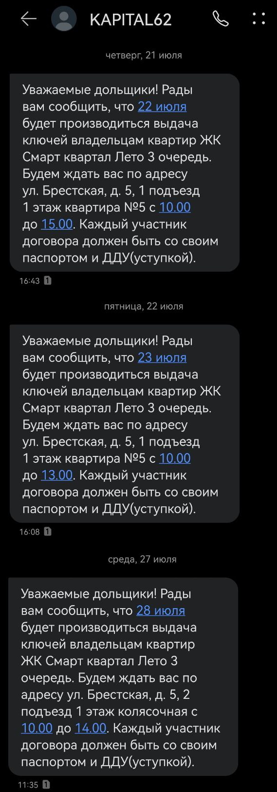 Но веселье только начиналось: вместо заблаговременного уведомления о готовности жилья к передаче в соответствие с законодательством РФ, агент застройщика решил обойтись рассылкой смс-сообщений, а на звонки с просьбой назначить дату заблаговременно отвечал одно и то же: ждите, вам позвонят.