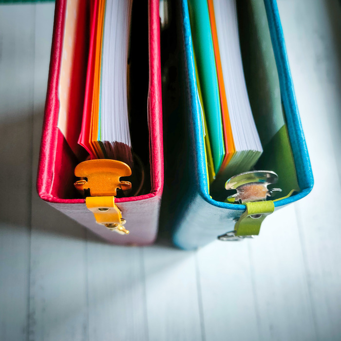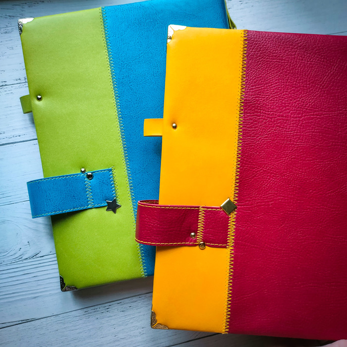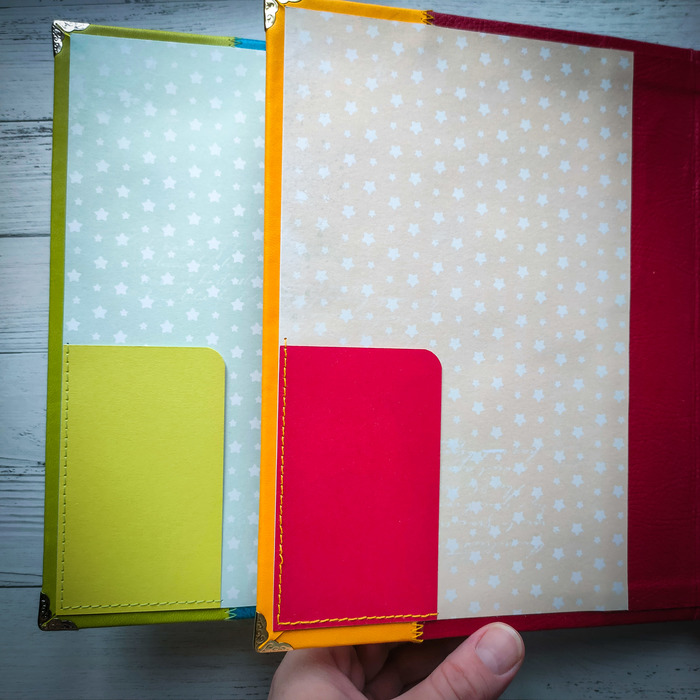 У меня даже сформировался определенный принцип создания этих блокнотов. Двухцветная обложка с эмблемой, хлястик, на корешке место для подвески, на первом форзаце кармашек уголком, на втором - два кармана один на другом, петелька для ручки, блок, конверт на магните, кольцевой механизм.