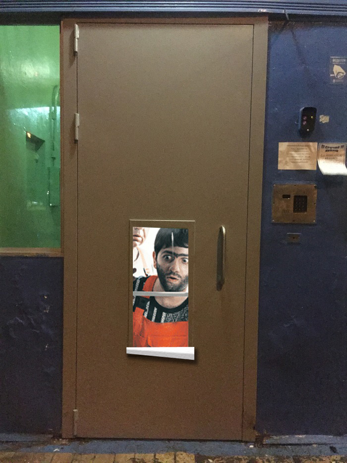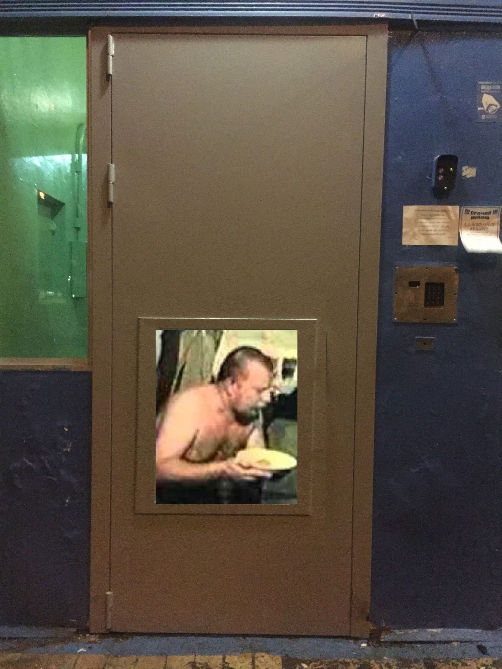 Ваша дверь выпадет из петель.Мне так кажется,что она с завода пришла с такими петлями,а мужики-монтажники думали,сделать не по плану,чтобы дверь нормально открывалась,но внутырь подъезда,или сделать так,как сделали.Вернуть дверь же лень,а окно в плане не указано,потому поступили проще.