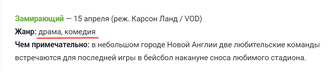 Чем примечательно: в небольшом городе Новой Англии две любительские команды встречаются для последней игры в бейсбол накануне сноса любимого стадиона.