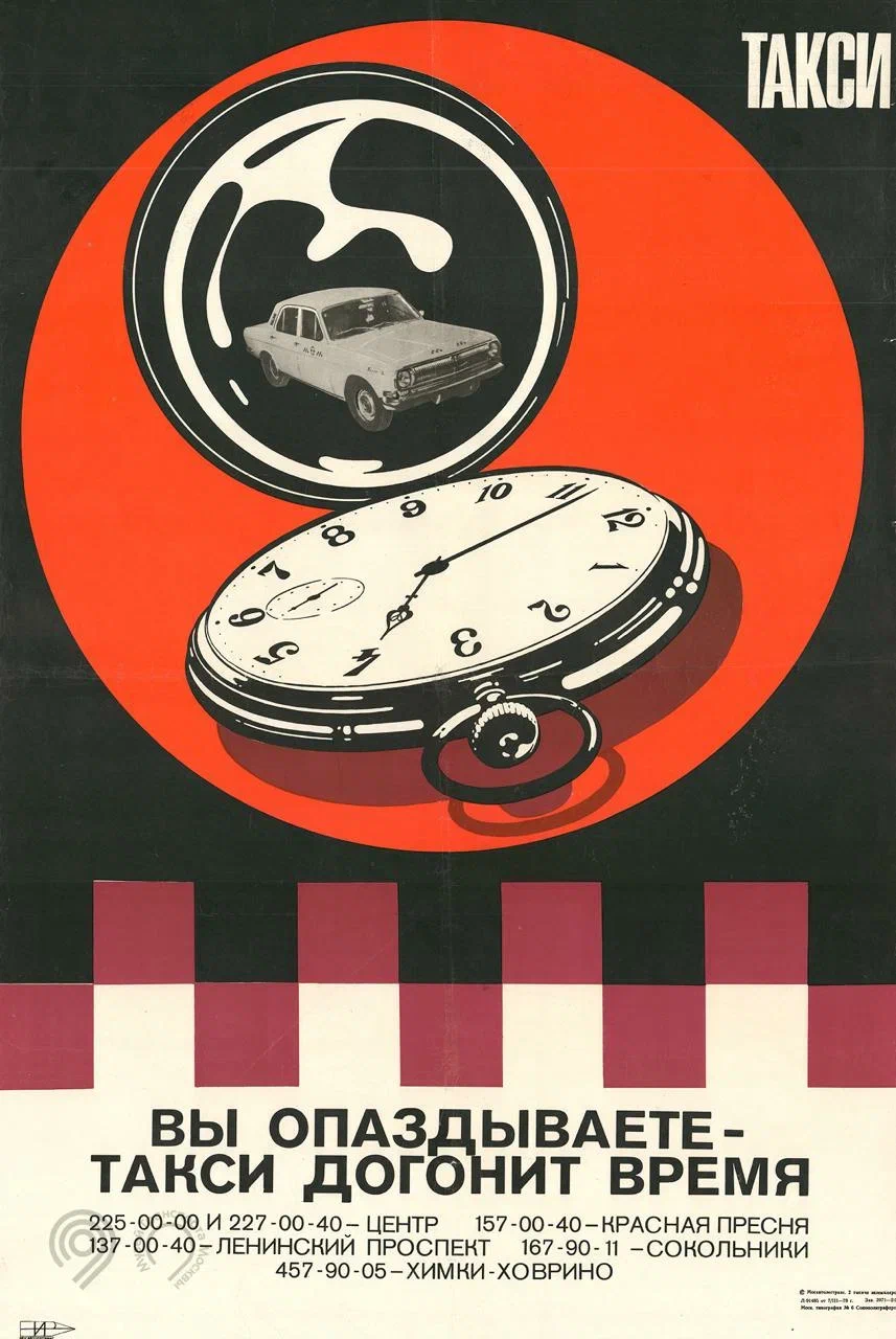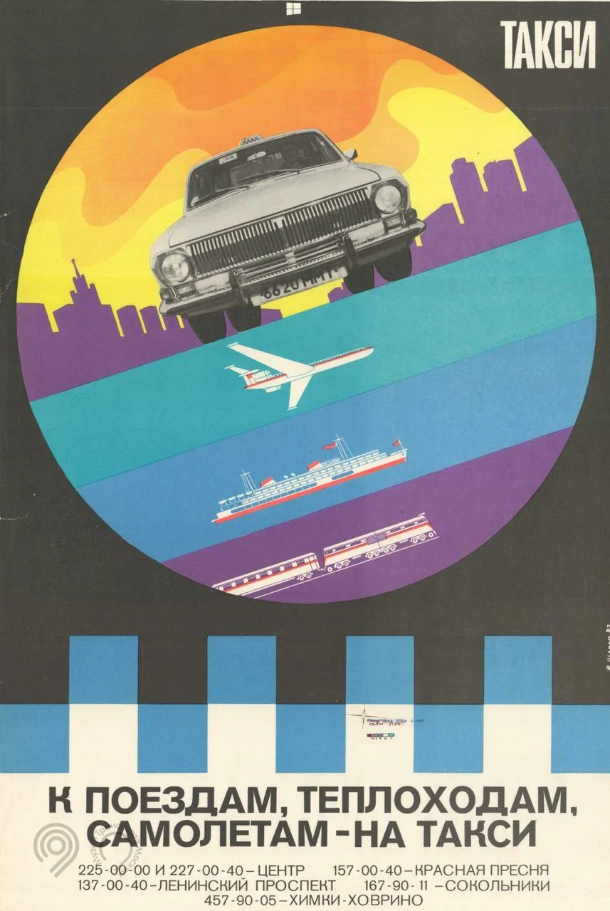 🔹 Плакаты убеждали горожан пользоваться услугами такси — удобным, современным и доступным видом транспорта.