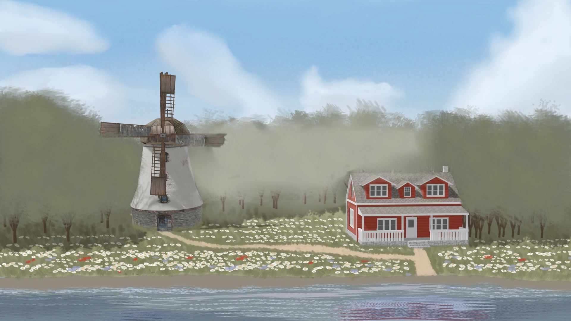 А вот ещё один цифровой пейзаж, нарисованный левой рукой. Дом у реки.