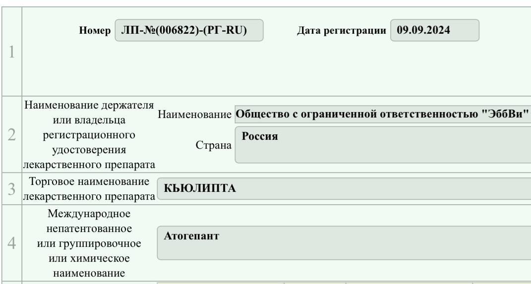 В сентябре 2024г. на территории России был зарегистрирован препарат АТОГЕПАНТ («Кьюлипта»).
