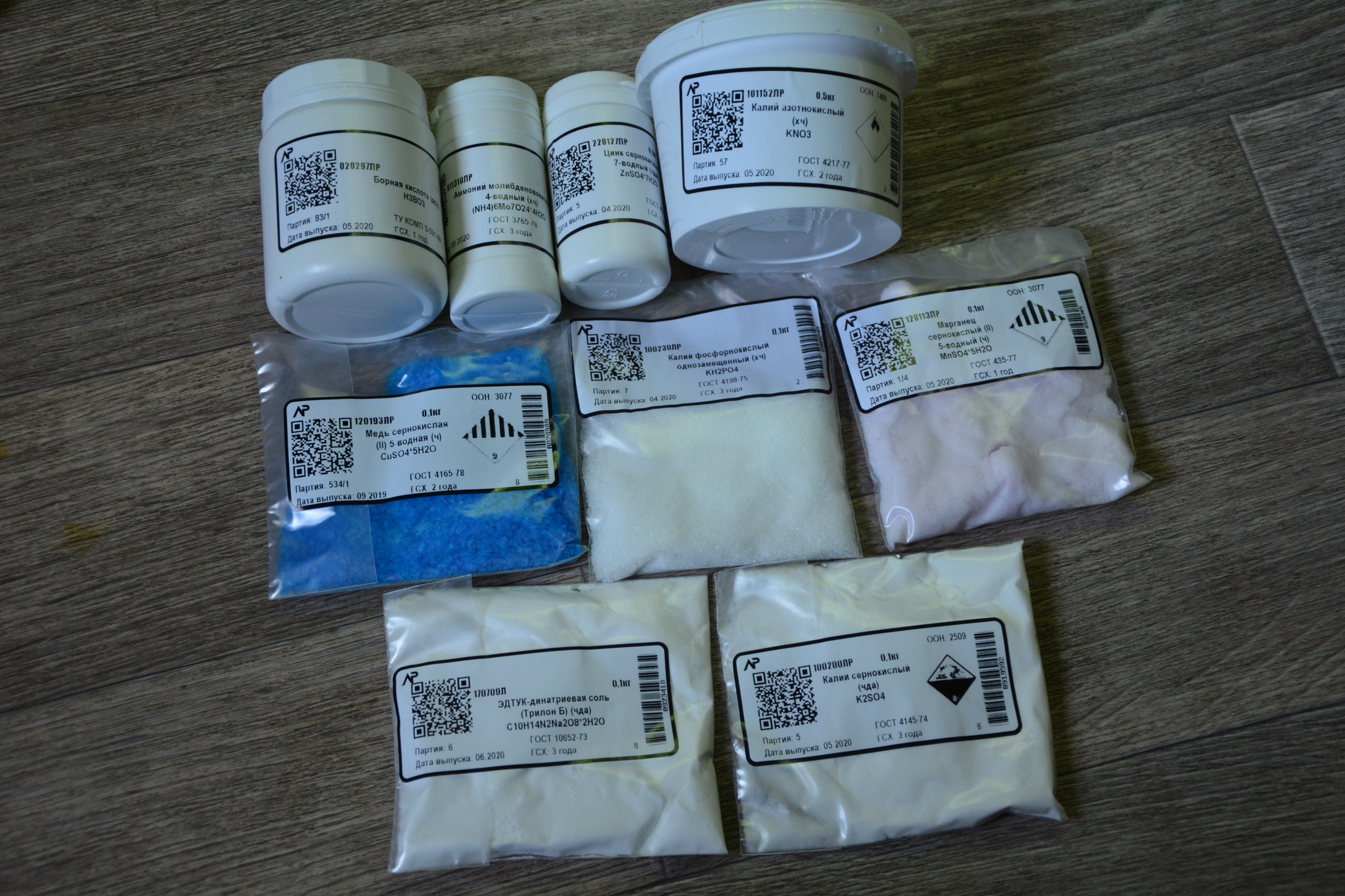 Система подачи удобрений. Состоит из самого дозатора, двух обратных клапанов на каждый канал, ёмкостей для удобрений и собственно самих удобрений.