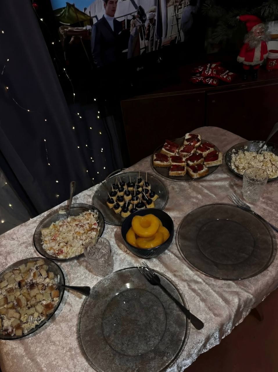 31 декабря был обычный рабочий день. Я трудилась до обеда, а потом меня сменил Андрей. Нужно было успеть приготовить салаты. Мы заранее продумали меню, хотя выбор продуктов был ограничен. В итоге на столе оказались: салат с ананасами, салат с крабовыми палочками (вместо яиц я использовала яичные блины), салат с курицей и фасолью, канапе с сыром и оливками, бутерброды с рыбой и конечно же персики!