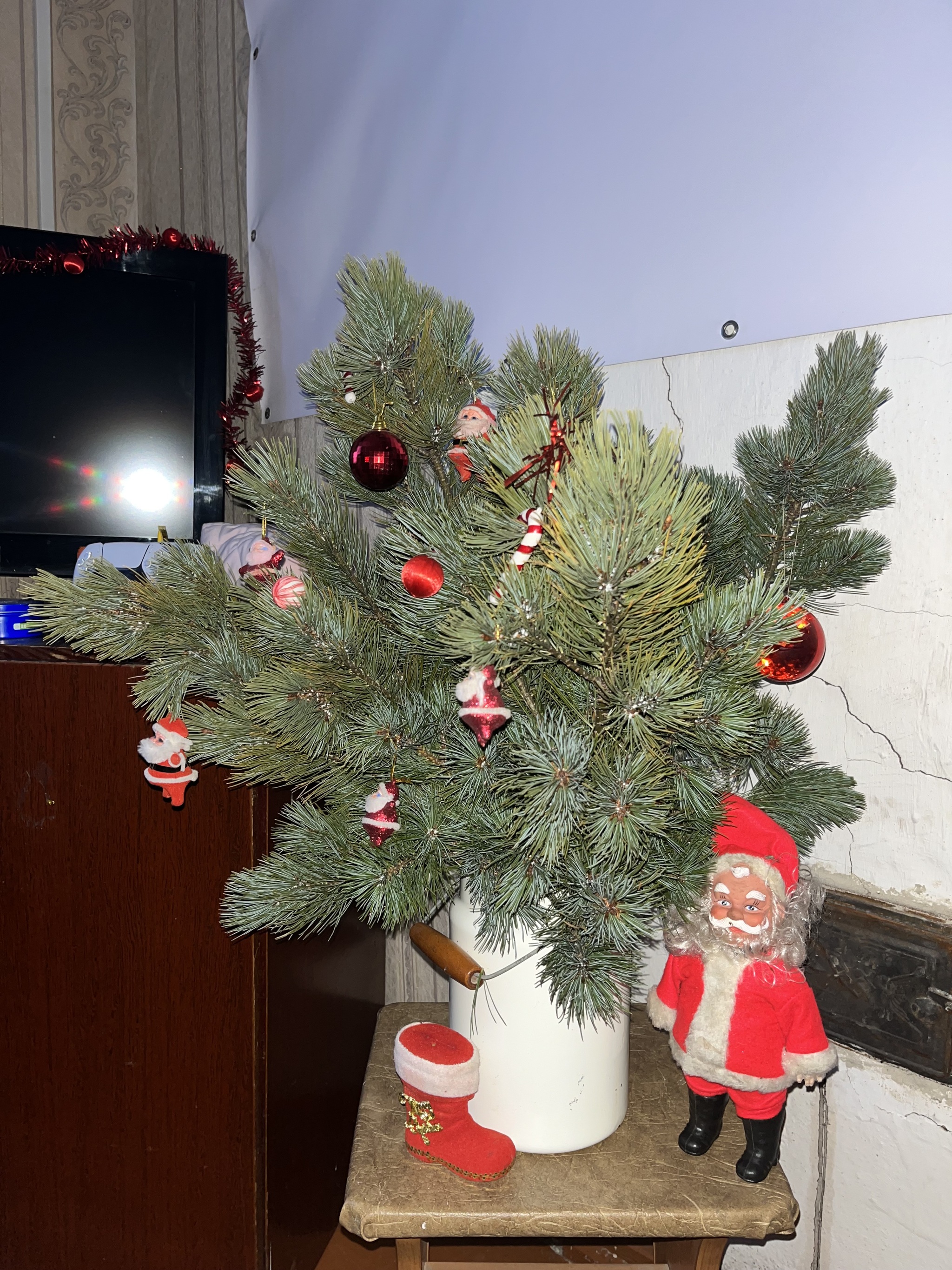 В ноябре я почти смирилась с тем, что ёлки у нас не будет. Мы не подумали о игрушках, когда были на материке. А какой же Новый год без ёлки? Но судьба преподнесла сюрприз: Андрей, разыскивая инструменты, наткнулся на коробку с ёлочными игрушками. Оставалось лишь раздобыть саму ёлку. Поскольку деревьев поблизости нет, мы решили аккуратно срезать несколько веточек с кедрового стланика с помощью секатора.