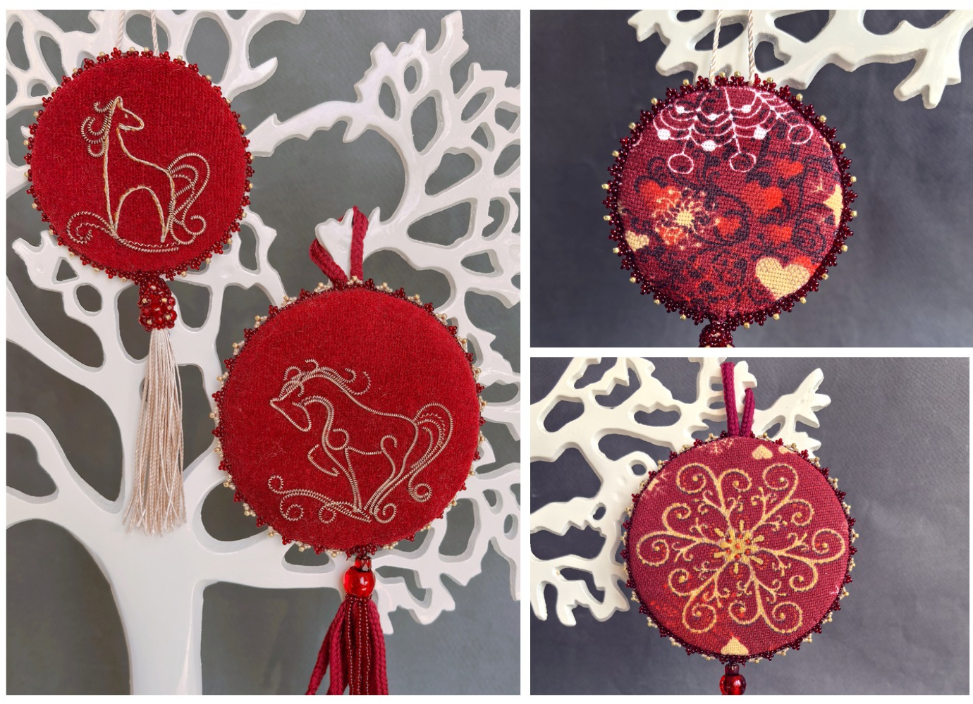 Заодно уж добавлю праздничные подвески - они тоже из бархата, тоже с вышивкой канителью и бисером.