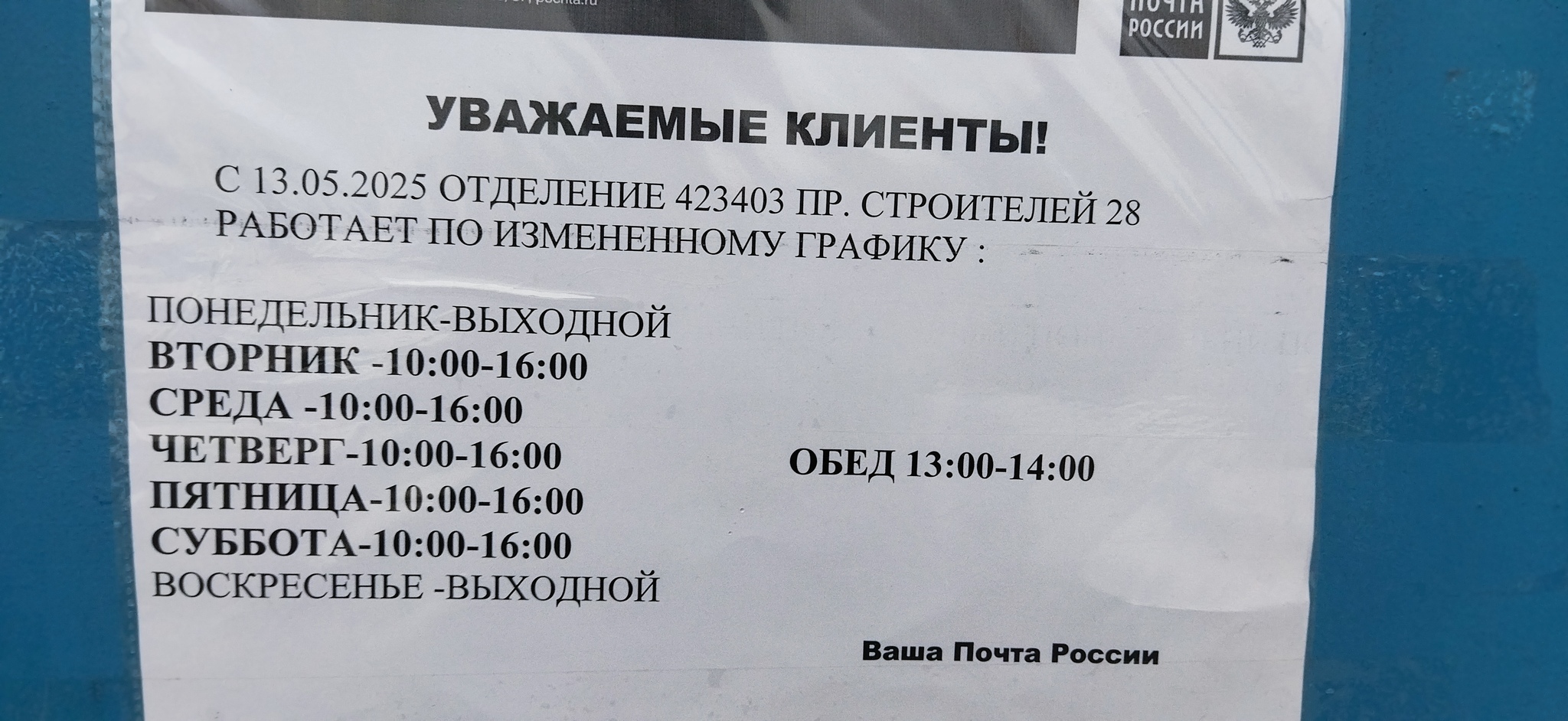 Действие происходит в г.Альметьевск. Решил я после работы отправить Авито доставку, приезжаю в одно отделение и тут висит новый график. Думаю хрен с вами, возможно, это только в этом отделении.