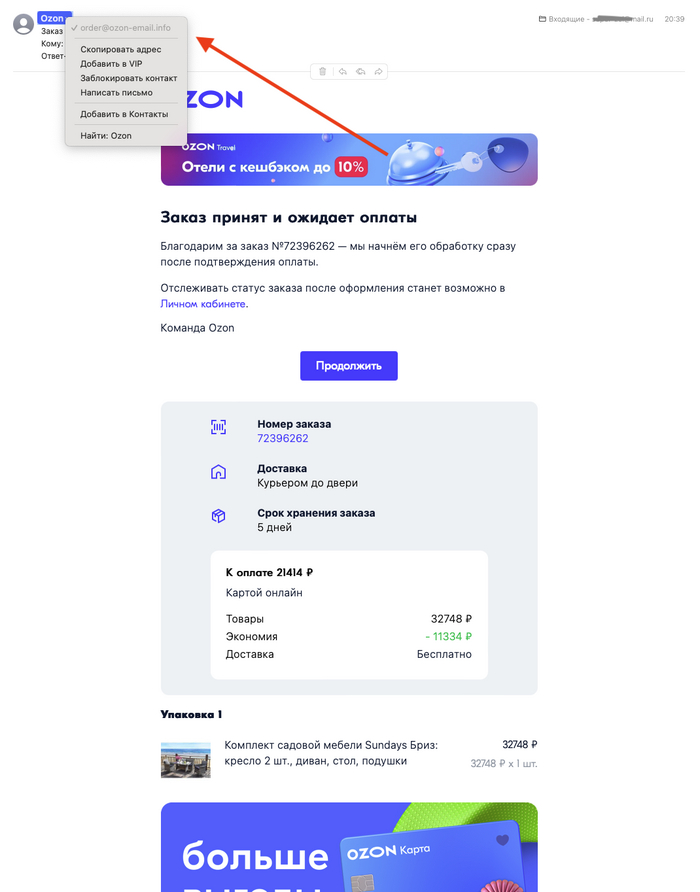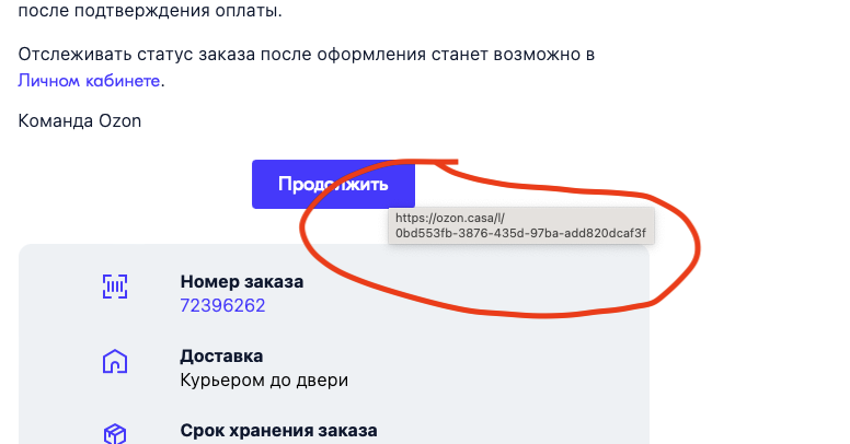 На почту приходит письмо с адреса ozon@ozon-email.info с оформлением 1 в 1 как в письмах от настоящего ozon.ru (домен у них кстати sender.ozon.ru). Кнопка "Продолжить" отправляет нас на https://ozon.casa/l/тут_uuid который редиректит нас на https://ozon.merchant-id7024.ru/gocheckout?id=%D1%82%D1%83%D...